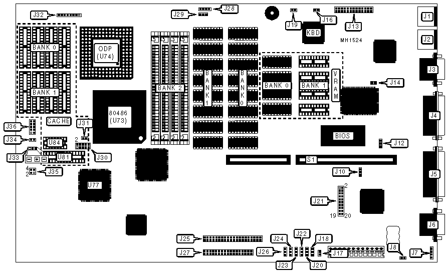 Note:If Bank 1 sockets are omitted from board, board was factory installed with 1MB of VRAM. Bank 0 is soldered to the board and should not be altered. | ||