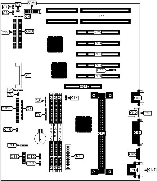 32-bit PCI slots (5), floppy drive interface, IDE interfaces (2), parallel port, PS/2 mouse port, serial ports (2), IR connector, USB connectors (2), ATX power connector, AGP slot, wake on modem connector |