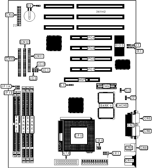 32-bit PCI slots (4), floppy drive interface, green PC connector, IDE interfaces (2), parallel port, PS/2 mouse port, serial ports (2), IR connector, USB connectors (2), ATX power connector, AGP slot, wake on modem connector |