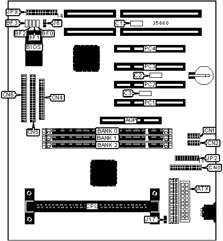 32-bit PCI slots (4), floppy drive interface, green PC connector, IDE interfaces (2), parallel port, PS/2 mouse interface, serial ports (2), IR connector, USB connectors (2), ATX power connector, AGP slot |