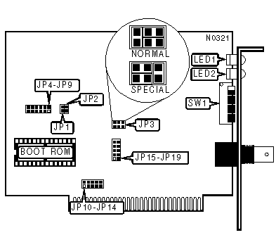 Note:In normal mode, any 32KB memory segment in the system may be selected. For an AT, however, with memory, display cards, and a hard drive controller, only 16KB of free memory space is available between CC000h and CFFFFh. In Special Mode the memory space occupied by the adapter is reduced by half to 16KB and the memory address is automatically set to CC000h. This overrides the base memory setting on JP15 and JP16.