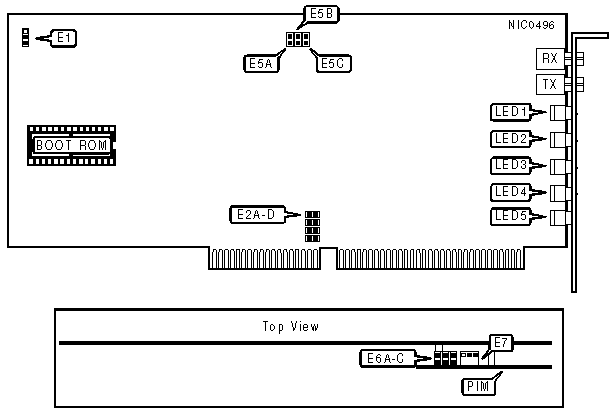 Note:With extended transmit timeout enabled, if the card is transmitting for an extented amount of time the transmission will be interrupted and continued after a preset time. This keeps the card from dominating the network. Signal Quality Error (SQE) is a test of the collision circuitry and path. E6 is located on the PIM. |