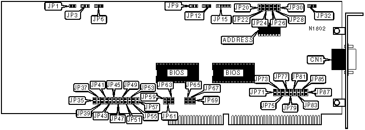 Note: A total of 64 base address settings are available. The jumpers are a binary representation of the decimal memory addresses. JP30 is the Most Significant Bit and jumper JP20 is the Least Significant Bit. Note that there is a break between JP26 and JP28. The jumpers have the following decimal values: JP30=8,388,608, JP28=4,194,304, JP26=131,072, JP24=65,536, JP22=32,768, JP20=16,384. Open the jumpers and add the values of the jumpers that are open to obtain the correct memory address. (Open=1, Closed=0) | |||||||