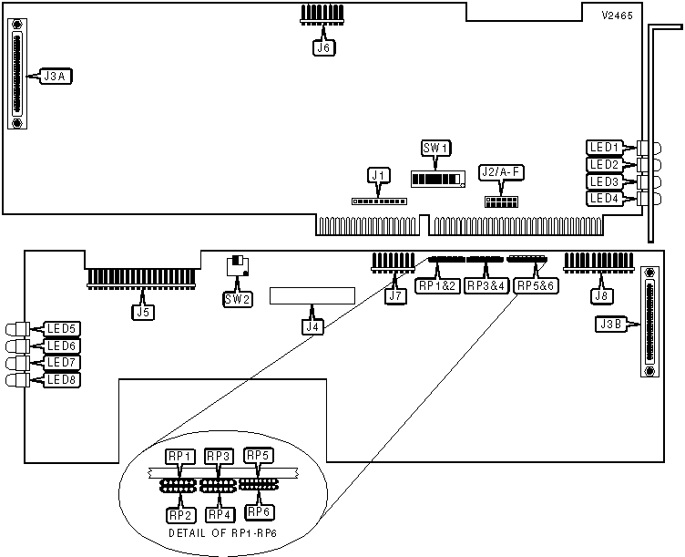 Note: A total of 128 base address settings are available. The switches are a binary representation of the decimal memory addresses. SW1/8 is the Most Significant Bit and switch SW1/2 is the Least Significant Bit. The switches have the following decimal values: SW1/8=512, SW1/7=256, SW1/6=128, SW1/5=64, SW1/4=32, SW1/3=16, SW1/2=8. Turn off the switches and add the values of the switches that are off to obtain the correct memory address. (Off=1, On=0)