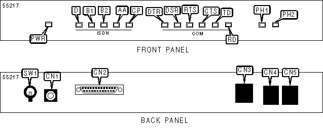 25-pin serial port, ISDN interface via RJ-45 connector (U or S/T), power analog telephone line out (2) |