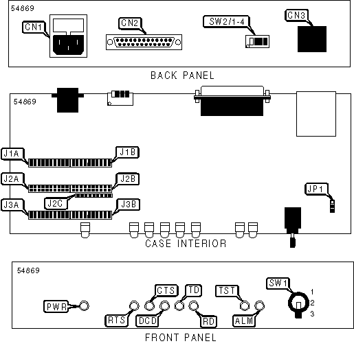AC power connector, 25-pin connector, network interface via RJ-48 connector |