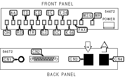 Line in (RJ-11), line out (RJ11), DTE port (25-pin serial connector) |