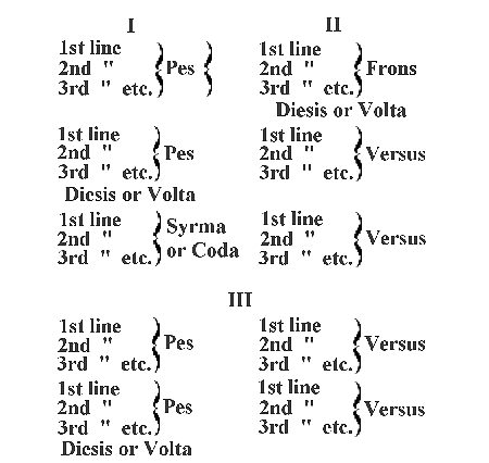 The love song or chanso was composed of five, six or seven stanzas (coblas) with, one or two tornadas or envois. The stanza varied in length from two to forty-two lines, though these limits are, of course, exceptional. An earlier form of the chanso was known as the vers; it seems to have been in closer relation to the popular poetry than the more artificial chanso, and to have had shorter stanzas and lines; but the distinction is not clear. As all poems were intended to be sung, the poet was also a composer; the biography of Jaufre Rudel, for instance, says that this troubadour "made many poems with good tunes but poor [24] words." The tune known as son (diminutive sonnet) was as much the property of a troubadour as his poem, for it implied and would only suit a special form of stanza; hence if another poet borrowed it, acknowledgment was generally made. Dante, in his De Vulgari Eloquentia, informs us concerning the structure of this musical setting: it might be continuous without repetition or division; or it might be in two parts, one repeating the other, in which case the stanza was also divided into two parts, the division being termed by Dante the diesis or volta; of these two parts one might be subdivided into two or even more parts, which parts, in the stanza, corresponded both in rimes and in the arrangement of the lines. If the first part of the stanza was thus divisible, the parts were called pedes, and the musical theme or oda of the first pes was repeated for the second; the rest of the stanza was known as the syrma or coda, and had a musical theme of its own. Again the first part of the stanza might be indivisible, when it was called the frons, the divided parts of the second half being the versus; in this case the frons had its own musical theme, as did the first versus, the theme of the first versus being repeated for the second. Or, lastly, a stanza might [25] consist of pedes and versus, one theme being used for the first pes and repeated for the second and similarly with the versus. Thus the general principle upon which the stanza was constructed was that of tripartition in the following three forms:—