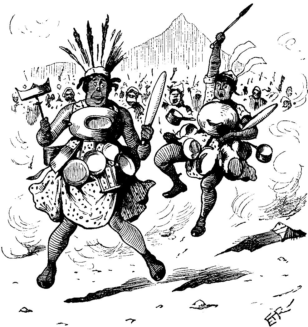The Aunt (still quoting). "In the famous work," BOBBY, "by which we know MASÛDI, he mentions the Persian Hezar Afsane-um-um-um,—nor have commentators failed to notice that the occasion of the book written for the Princess HOMAI resembles the story told in the Hebrew Bible about ESTHER, her mother or grandmother, by some Persian Jew two or three centuries B.C." Well, I never knew that before!... This is "Sindbad and the Old Man of the Sea"—let's see what they say about him. (Reads.) "Both the story of Sindbad and the old Basque legend of Tartaro are undoubtedly borrowed from the Odyssey of HOMER, whose Iliad and Odyssey were translated into Syriac in the reign of HARUN-UR-RASHID." Dear, dear, how interesting, now! and, BOBBY, what do you think someone says about "Jack and the Beanstalk"? He says—"this tale is an allegory of the Teutonic Al-fader, the red hen representing the all-producing sun: the moneybags, the fertilising rain; and the harp, the winds." Well, I'm sure it seems likely enough, doesn't it?