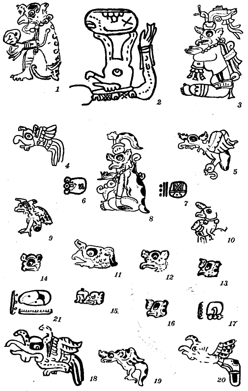 We have not limited ourselves entirely to the Maya manuscripts as we have drawn upon the vast amount of material available in the stone carvings, the stucco figures, and the frescoes found throughout the Maya area. This material has by no means been exhausted in the present paper. In addition to the figures from the Maya codices and a comparatively few from other sources in the Maya region, we have introduced for comparison in a number of cases figures from a few of the ancient manuscripts of the Nahuas and the Zapotecs to the north. The calendar of these two peoples is fundamentally the same as that of the Mayas. The year is made up in the same way being composed of eighteen months of twenty days each with five days additional at the end of the year. There is therefore a more or less close connection as regards subject matter in all the pre-Columbian codices of Mexico and Central America but the manner of presentation differs among the different peoples of this region.