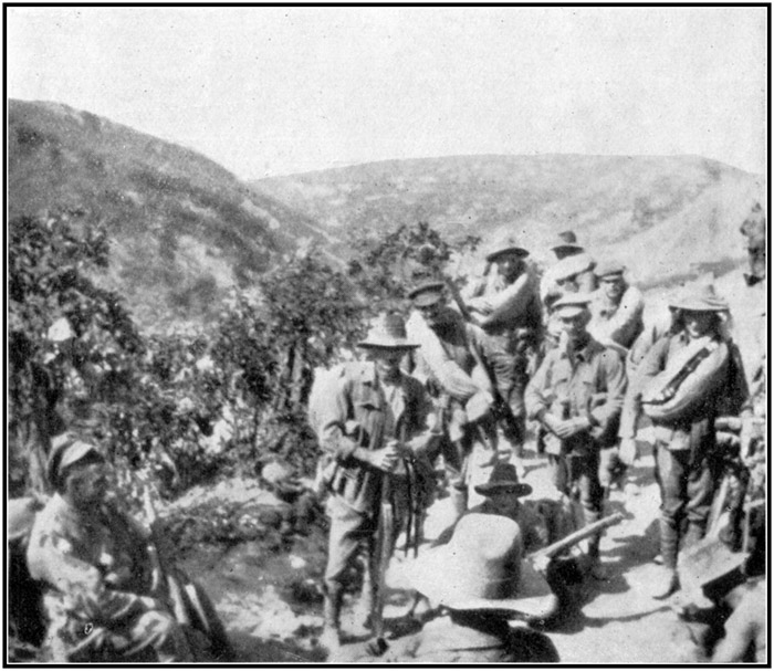 Lower Cheshire Ridge—Description of new position—A break in the weather—Trenches—Tunnels—Timber and iron—Sniping—Ruses —The Mohammedan festival—Arrival of reinforcements—Promotion from the ranks—Formation of bombing section—Change in command of Brigade —Canteen stores—Pay—A miss—Aeroplanes— Relieved by the 4th Brigade—Taylor's Hollow—Beach fatigues —Soldiers as sailors—News —Mails from Australia—Diversions— The naturalist—The beauties of land, sea, and sky. Page 102.