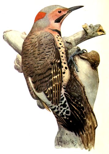 The flicker often telegraphs his love by tapping either on a forest tree or on some loose board of a barn or outhouse; but he has other ways of courting his lady. On fine spring mornings, late in April, I have seen them on a horizontal bough, the lady sitting quietly while her lover tried to win her approval by strange antics. Quite often there are two males displaying their charms in open rivalry, but once I saw them when the field was clear. If fine clothes made a gentleman, this brave wooer would have been first in all the land: for his golden wings and tail showed their glittering under side as he spread them; his scarlet headdress glowed like fire; his rump was radiantly white, not to speak of the jetty black of his other ornaments and[19] the beautiful ground-colors of his body. He danced before his lady, showing her all these beauties, and perhaps boasting a little of his own good looks, though she was no less beautiful. He spread his wings and tail for her inspection; he bowed, to show his red crescent; he bridled, he stepped forward and back and sidewise with deep bows to his mistress, coaxing her with the mellowest and most enticing co-wee-tucks, which no doubt in his language meant “Oh, promise me,” laughing now and then his jovial wick-a-wick-a-wick-a-wick-a, either in glee or nervousness. It was all so very silly—and so very nice! I wonder how it all came out. Did she promise him? Or did she find a gayer suitor?[20]
