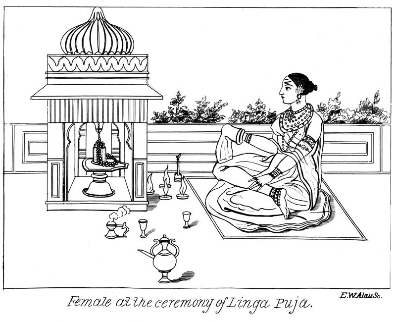 Lingas are of all sizes and of various forms. Sometimes they are extremely minute, being then enclosed in small silver reliquaries, and worn as amulets or charms upon the breast or arm. At other times they are several inches in height, as in the domestic examples, and often have the bull Nandi carved either at the end of the yoni or at the side of the emblem. The Hindus say that the bull will intercept the evil which is continually emitted from the female sacti. Upon the erection of a new village, in setting up the Linga, they are careful to turn the spout of the yoni towards the jungle, and not upon the houses or roads, lest ill fortune should rest upon them. These Lingams are of a much larger size than those just mentioned, being generally two or three feet in height. Early in the morning around these emblems may be seen the girls of the neighbourhood who are anxious for husbands, sprinkling them with water from the Ganges; decking them with garlands of bilwa flowers; performing the mudra, or gesticulation with the fingers, and while rubbing themselves against the emblem, reciting the prescribed incantations, and entreating the deity to make them the fruitful mother of children.