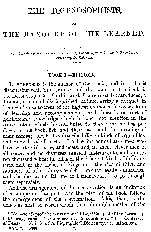 1. Athenæus is the author of this book; and in it he is discoursing with Timocrates: and the name of the book is the Deipnosophists. In this work Laurentius is introduced, a Roman, a man of distinguished fortune, giving a banquet in his own house to men of the highest eminence for every kind of learning and accomplishment; and there is no sort of gentlemanly knowledge which he does not mention in the conversation which he attributes to them; for he has put down in his book, fish, and their uses, and the meaning of their names; and he has described divers kinds of vegetables, and animals of all sorts. He has introduced also men who have written histories, and poets, and, in short, clever men of all sorts; and he discusses musical instruments, and quotes ten thousand jokes: he talks of the different kinds of drinking cups, and of the riches of kings, and the size of ships, and numbers of other things which I cannot easily enumerate, and the day would fail me if I endeavoured to go through them separately.