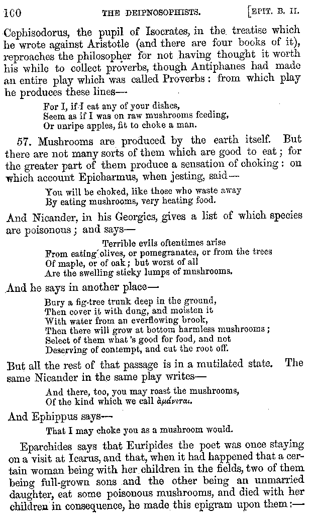 11. But Phanias says that Philoxenus of Cythera, a poet, being exceedingly fond of eating, once when he was supping with Dionysius, and saw a large mullet put before him and a small one before himself, took his up in his hands and put it to his ear; and, when Dionysius asked him why he did so, Philoxenus said that he was writing Galatea, and so he wished to ask the fish some of the news in the kingdom of Nereus; and that the fish which he was asking said that he knew nothing about it, as he had been caught young; but that the one which was set before Dionysius was older, and was well acquainted with everything which he wished to know. On which Dionysius laughed, and sent him the mullet which had been set before himself. And Dionysius was very fond of drinking with Philoxenus, but when he detected him in trying to seduce Galatea, whom he himself was in love with, he threw him into the stone quarries; and while there he wrote the Cyclops, constructing the fable with reference to what had happened to himself; representing Dionysius as the Cyclops, and the flute-player as Galatea, and himself as Ulysses.