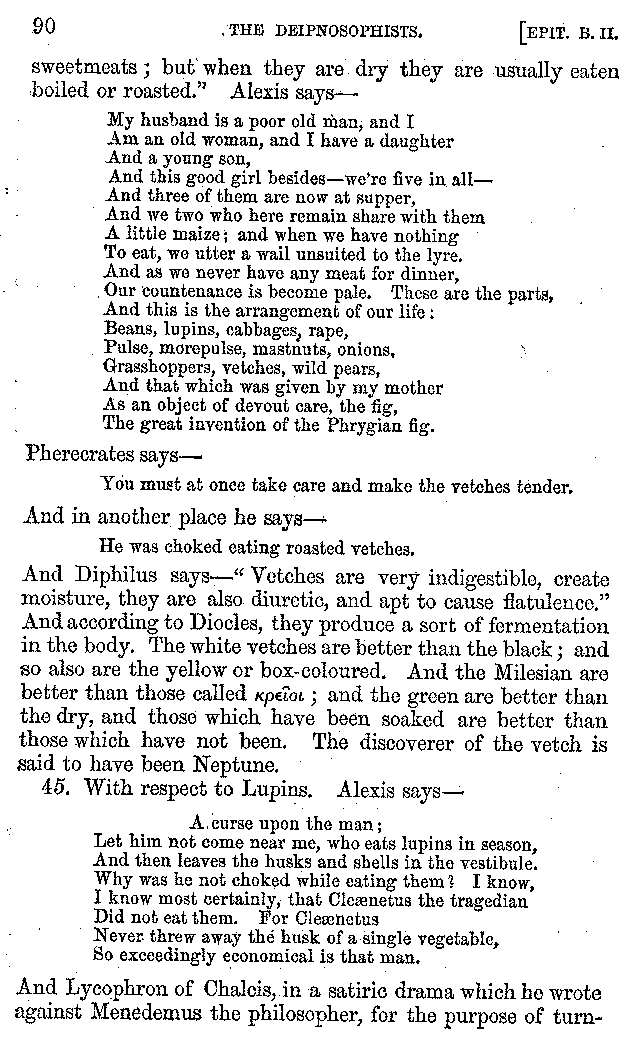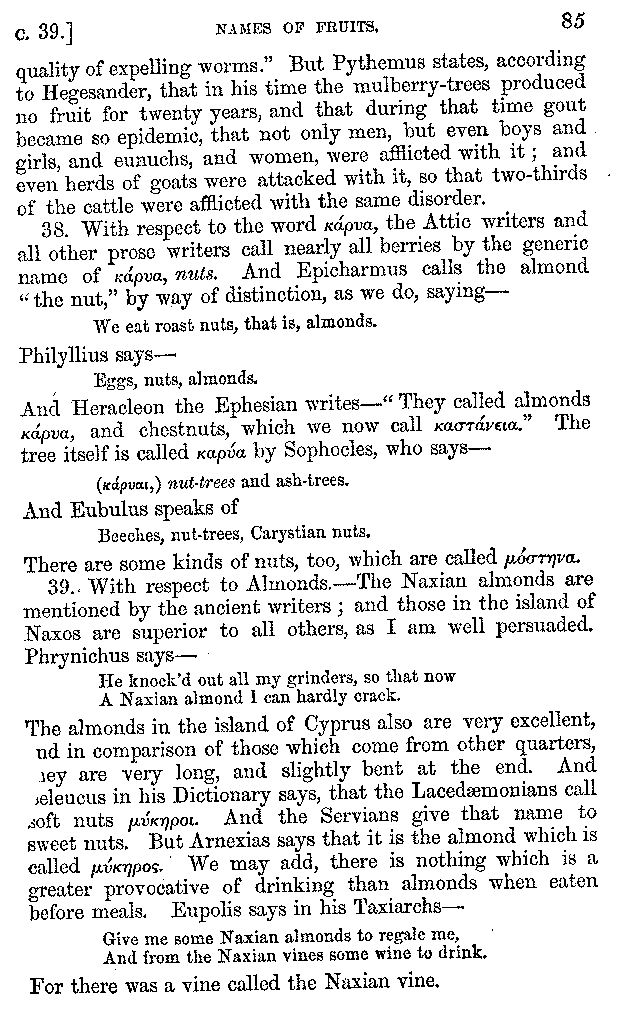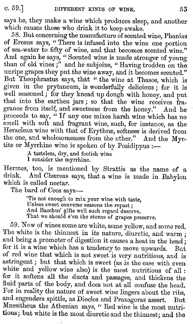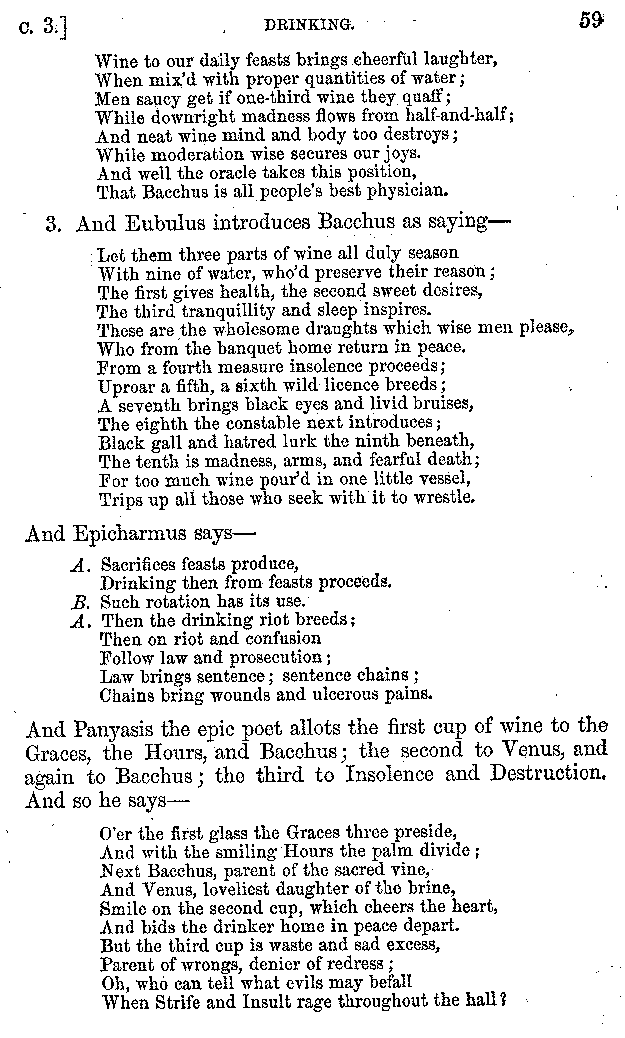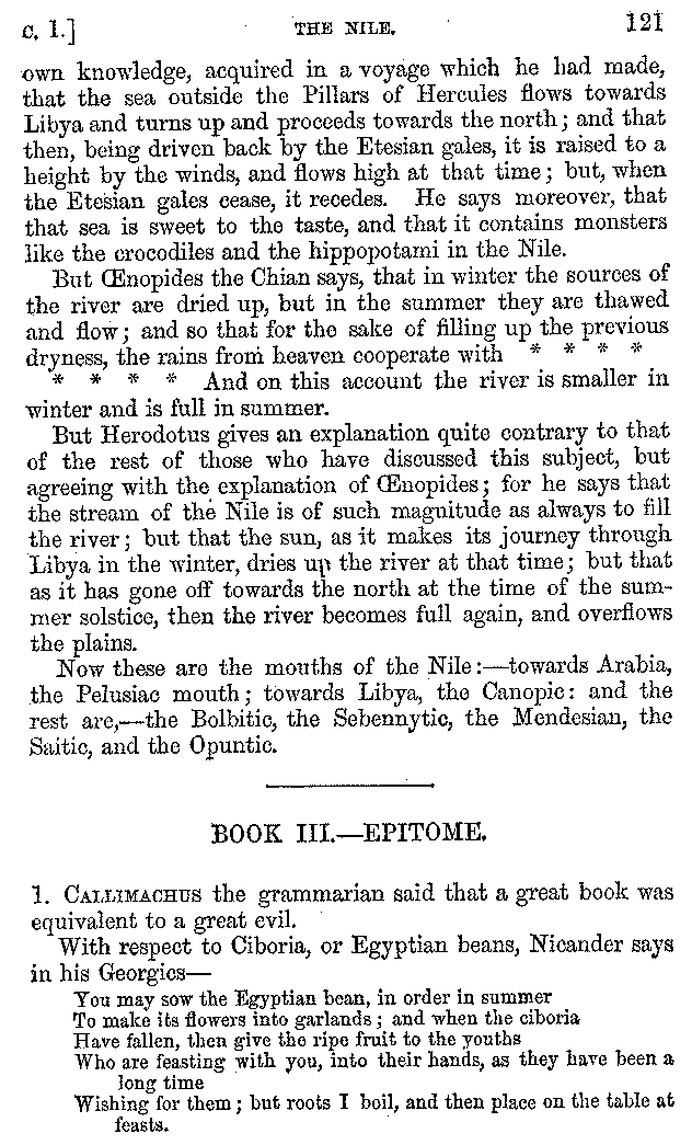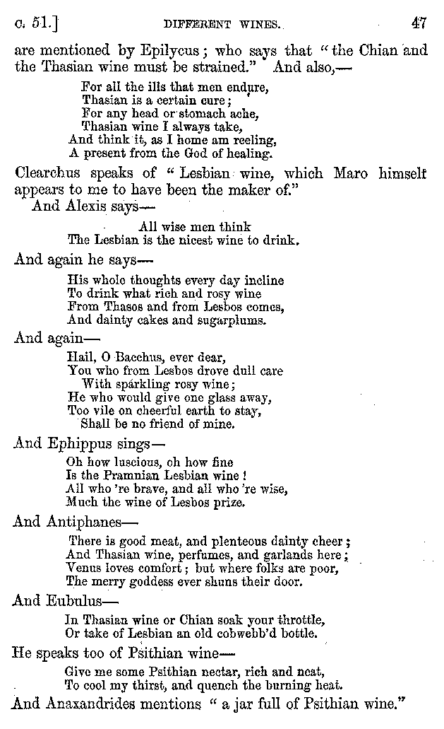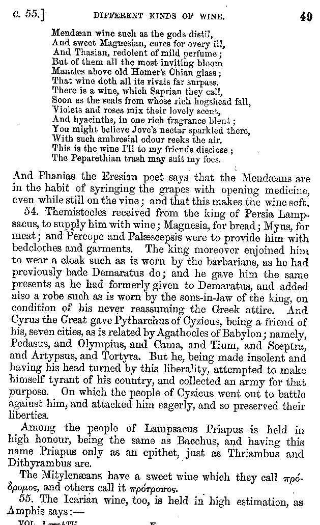 | Wine—Drinking—The evils of Drunkenness—Praises of Wine—Water—Different kinds of Water—Sweetmeats—Couches and Coverlets—Names of Fruits—Fruit and Herbs—Lupins—Names of—Plants—Eggs—Gourds—Mushrooms—Asparagus—Onions—Thrushes—Brains—The Head—Pickle—Cucumbers—Lettuce—The Cactus—The Nile | 57-121 |