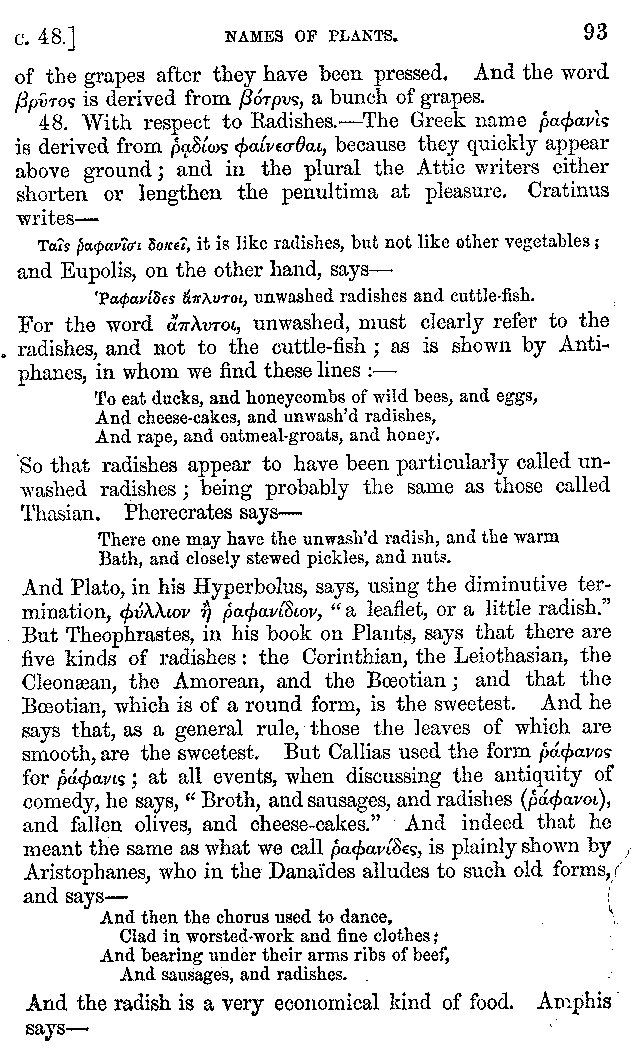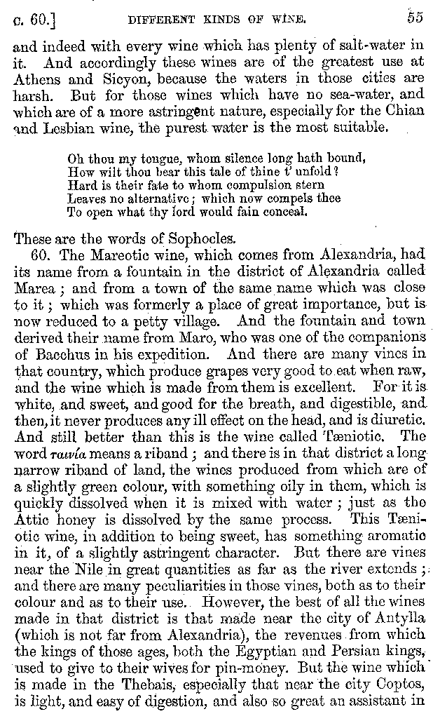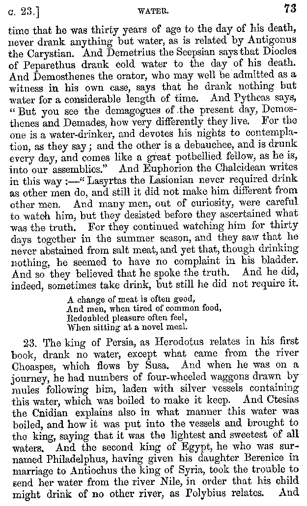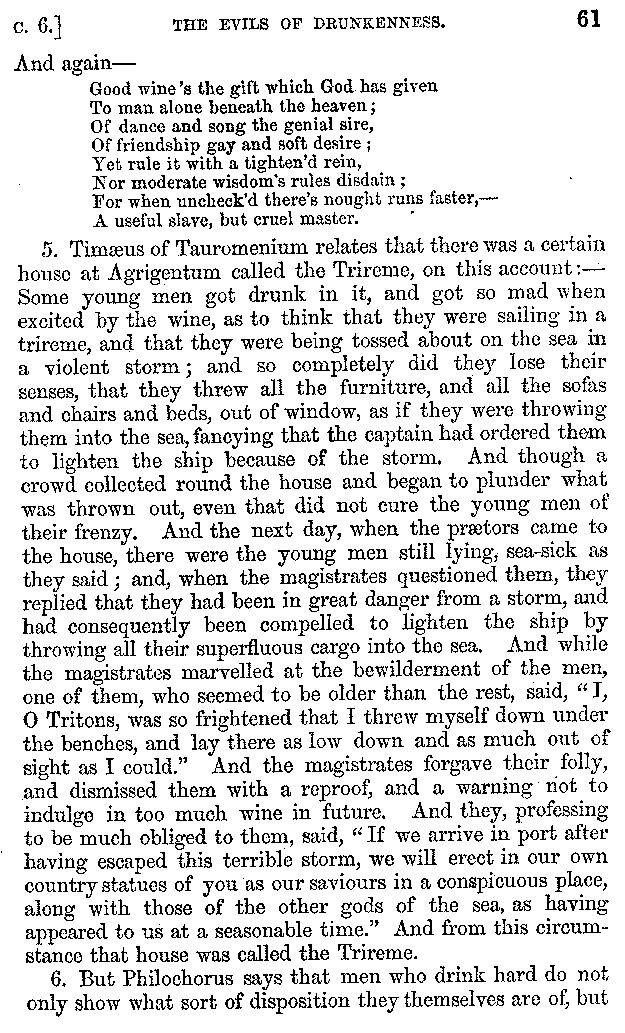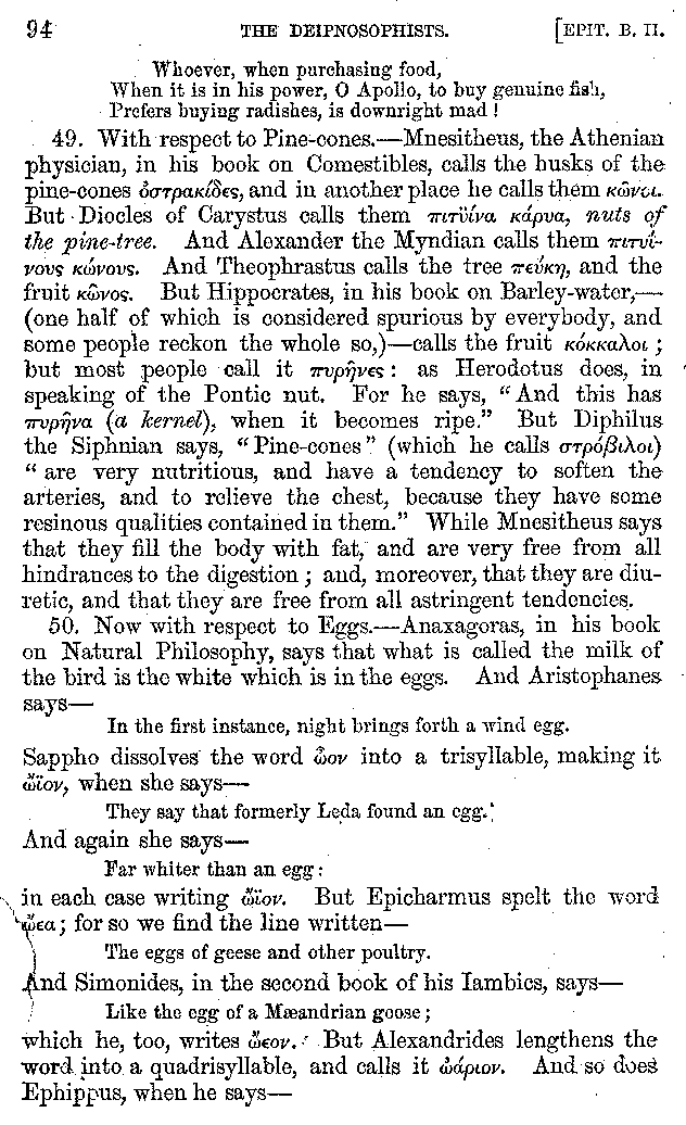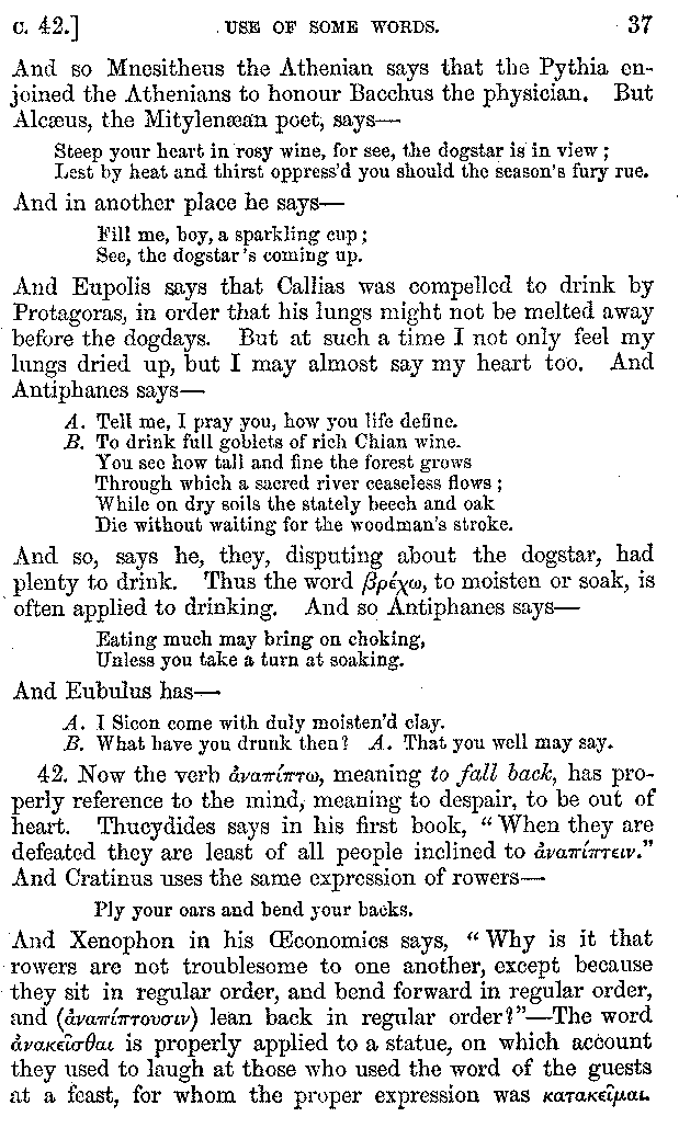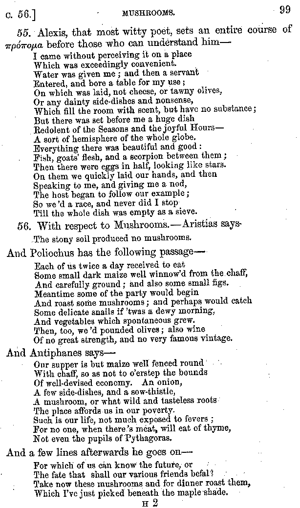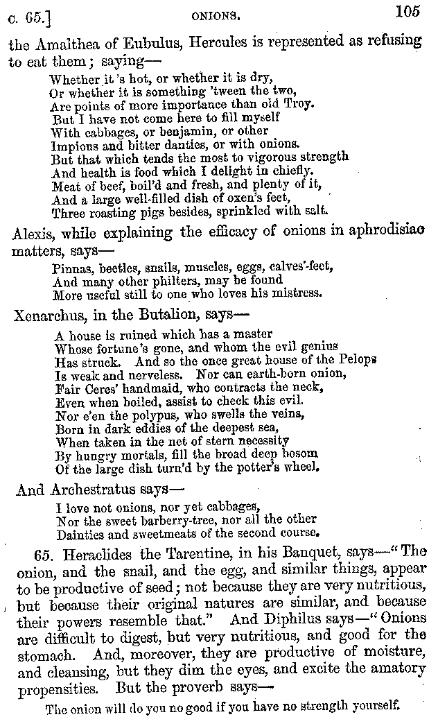 | Wine—Drinking—The evils of Drunkenness—Praises of Wine—Water—Different kinds of Water—Sweetmeats—Couches and Coverlets—Names of Fruits—Fruit and Herbs—Lupins—Names of—Plants—Eggs—Gourds—Mushrooms—Asparagus—Onions—Thrushes—Brains—The Head—Pickle—Cucumbers—Lettuce—The Cactus—The Nile | 57-121 |