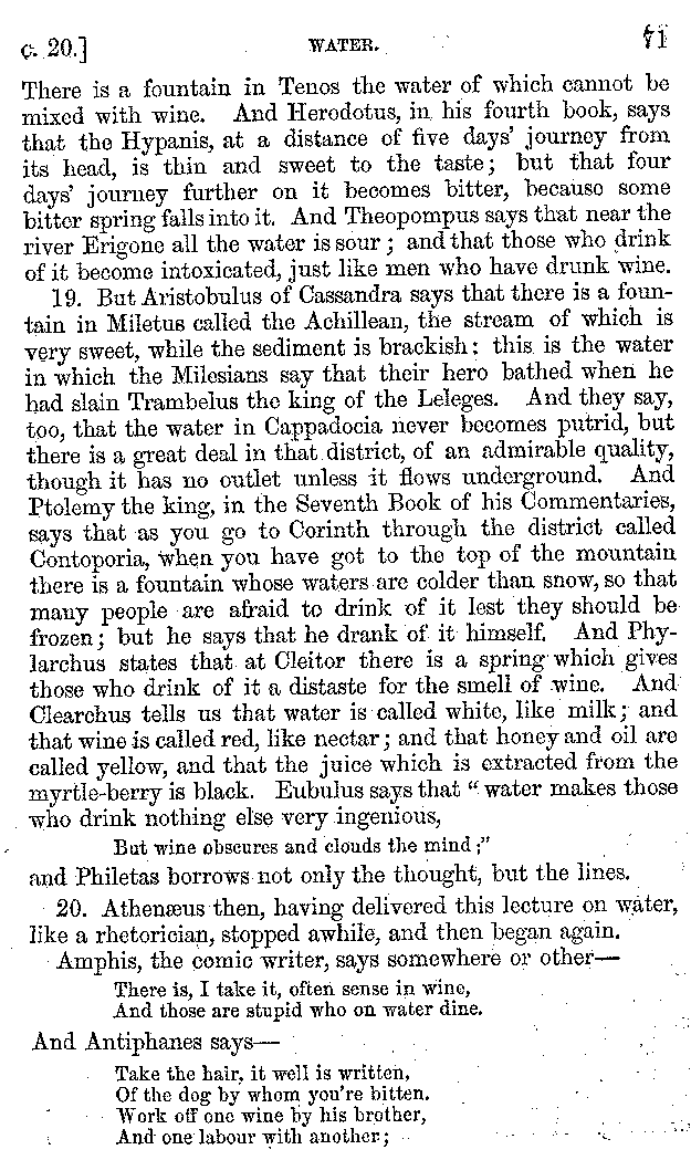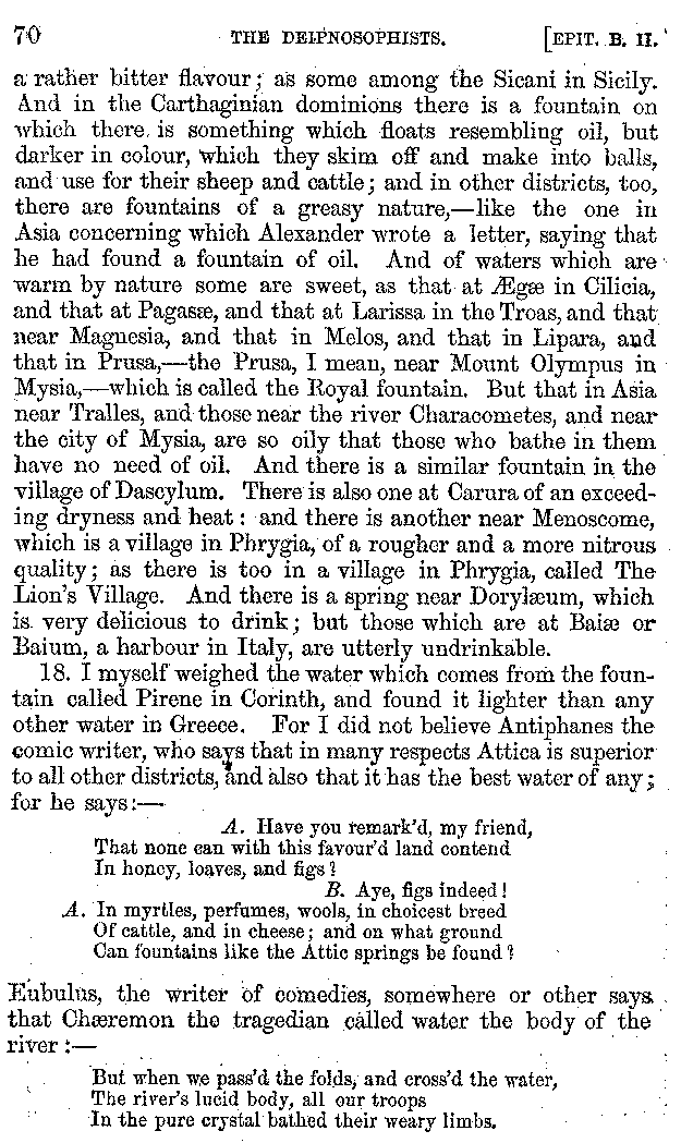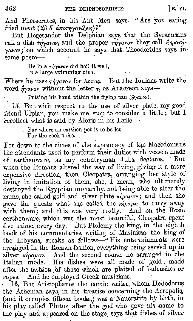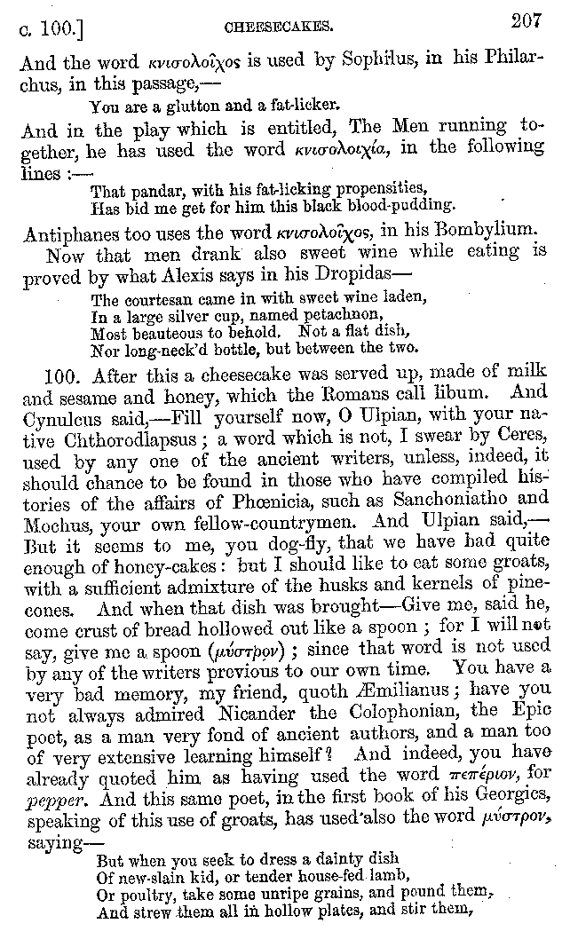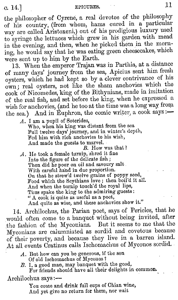 12. About the time of Tiberius there lived a man named Apicius; very rich and luxurious; from whom several kinds of cheesecakes are called Apician. He spent myriads of drachms on his belly, living chiefly at Minturnæ, a city of Campania, eating very expensive crawfish, which are found in that place superior in size to those of Smyrna, or even to the crabs of Alexandria. Hearing too that they were very large in Africa, he sailed thither, without waiting a single day, and suffered exceedingly on his voyage. But when he came near the place, before he disembarked from the ship, (for his arrival made a great noise among the Africans,) the fishermen came alongside in their boats and brought him some very fine crawfish; and he, when he saw them, asked if they had any finer; and when they said that there were none finer than those which they brought, he, recollecting those at Minturnæ, ordered the master of the ship to sail back the same way into Italy, without going near the land. But Aristoxenus, [11]the philosopher of Cyrene, a real devotee of the philosophy of his country, (from whom, hams cured in a particular way are called Aristoxeni,) out of his prodigious luxury used to syringe the lettuces which grew in his garden with mead in the evening, and then, when he picked them in the morning, he would say that he was eating green cheesecakes, which were sent up to him by the Earth.