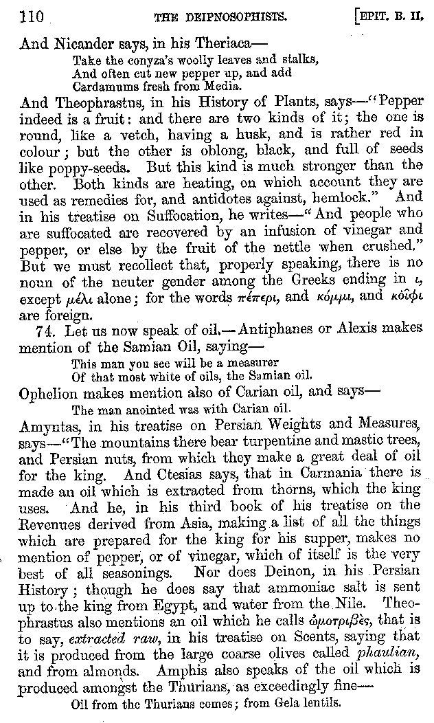Many such men then as these, he says, were present at Laurentius's supper; bringing books out of their bags, as their contribution to the picnic. And he says also that Charmus, having something ready for everything that was served up, as has been already said, appeared to the Massenians to be a most accomplished man; as also did Calliphanes, who was called the son of Parabrycon, who having copied out the beginnings of many poems and other writings, recollected three or four stanzas of each, aiming at a reputation for extensive learning. And many other men had in their mouths turbots caught in the Sicilian sea, and swimming eels, and the trail of the tunny-fish of Pachynum, and kids from Melos, and mullets from Symæthus. And, of dishes of less repute, there were cockles from Pelorum, anchovies from Lipara, turnips from Mantinea, rape from Thebes, and beet-root from the Ascræans. And Cleanthes the Tarentine, as Clearchus says, said everything while the drinking lasted, in metres. And so did Pamphilus the Sicilian, in this way:—