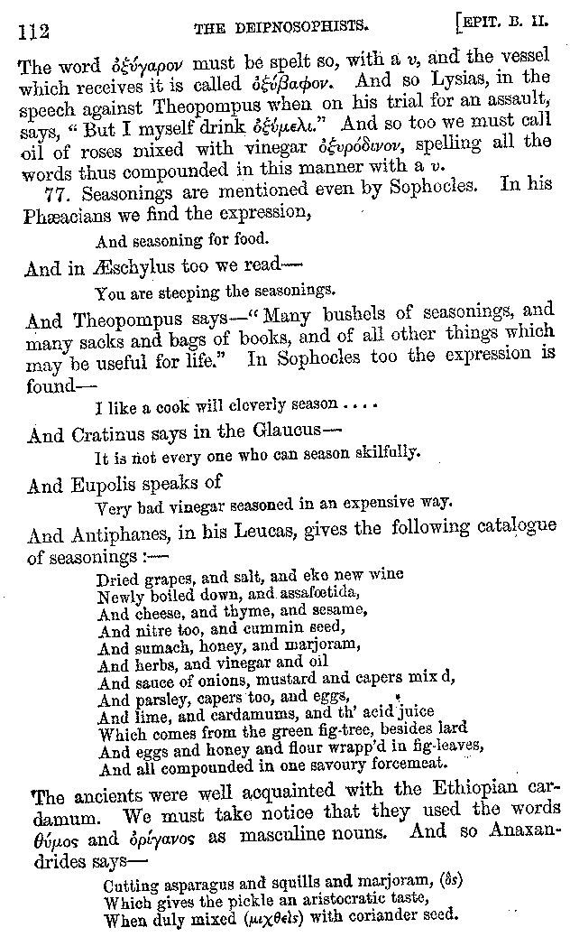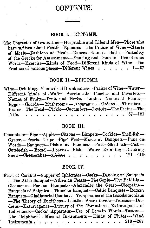 | The Character of Laurentius—Hospitable and Liberal Men—Those who have written about Feasts—Epicures—The Praises of Wine—Names of Meals—Fashions at Meals—Dances—Games—Baths—Partiality of the Greeks for Amusements—Dancing and Dancers—Use of some Words—Exercise—Kinds of Food—Different kinds of Wine—The Produce of various places—Different Wines | 1-57 |