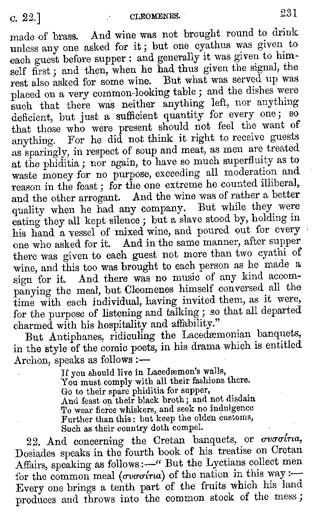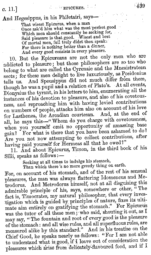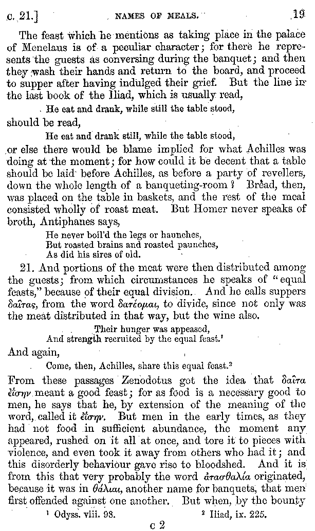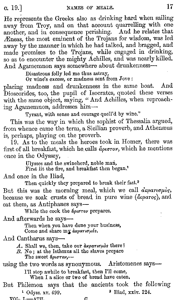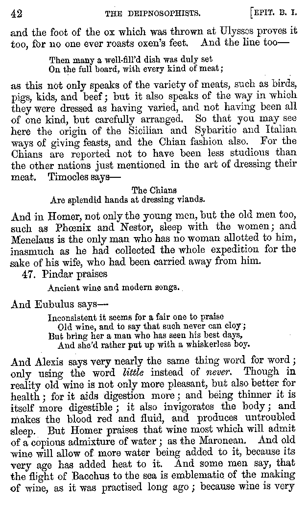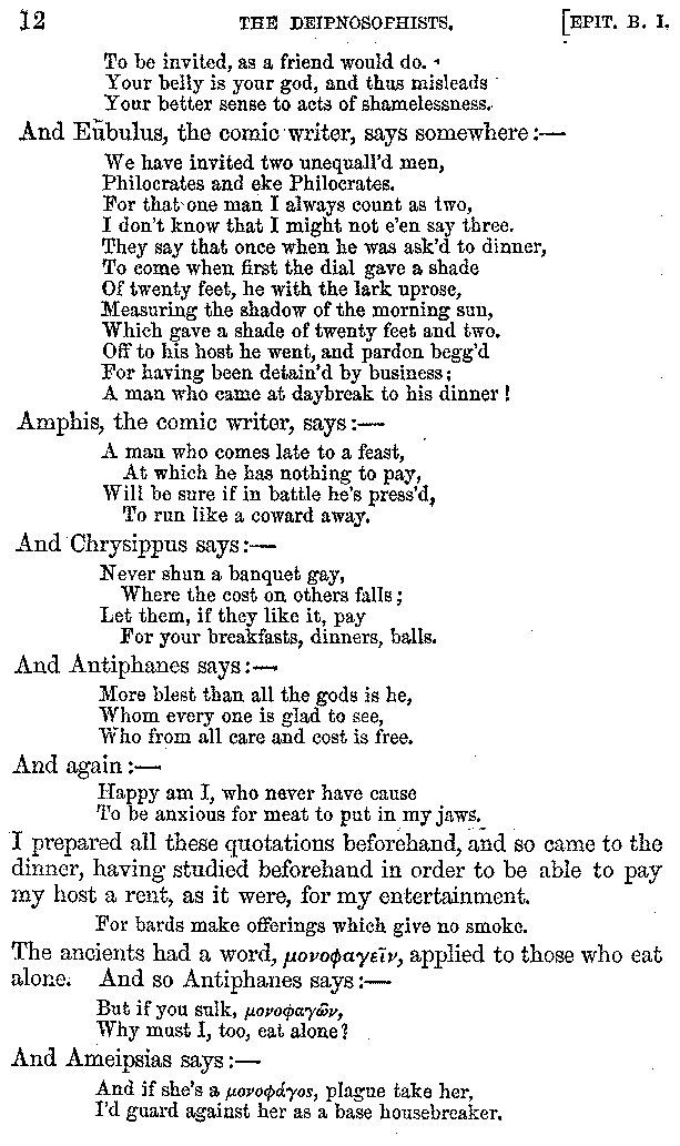 And the arrangement of the conversation is an imitation of a sumptuous banquet; and the plan of the book follows the arrangement of the conversation. This, then, is the delicious feast of words which this admirable master of the [2]feast, Athenæus, has prepared for us; and gradually surpassing himself, like the orator at Athens, as he warms with his subject, he bounds on towards the end of the book in noble strides.