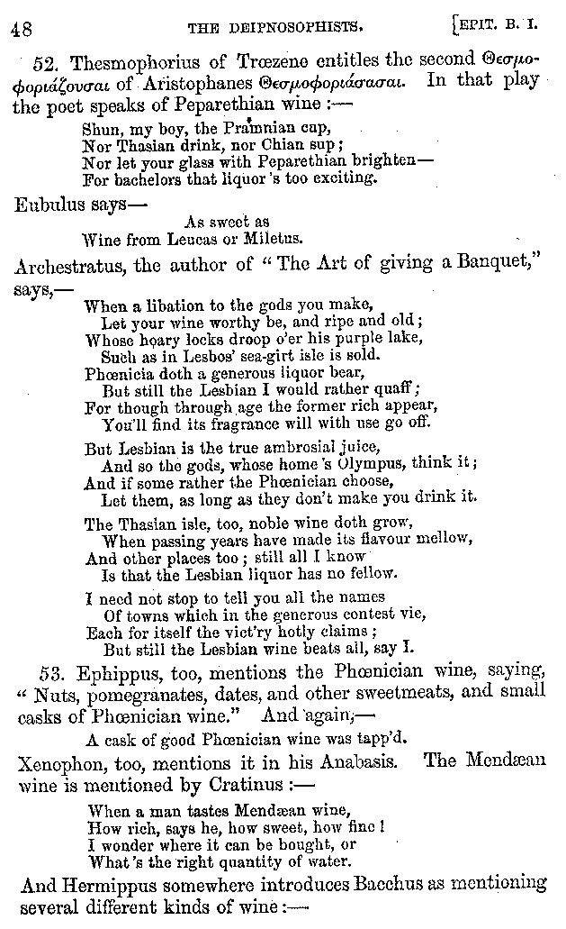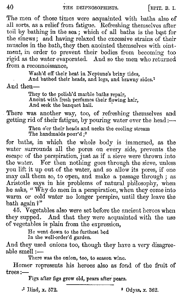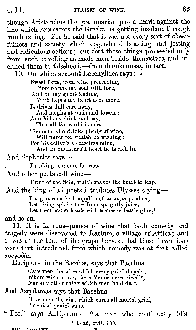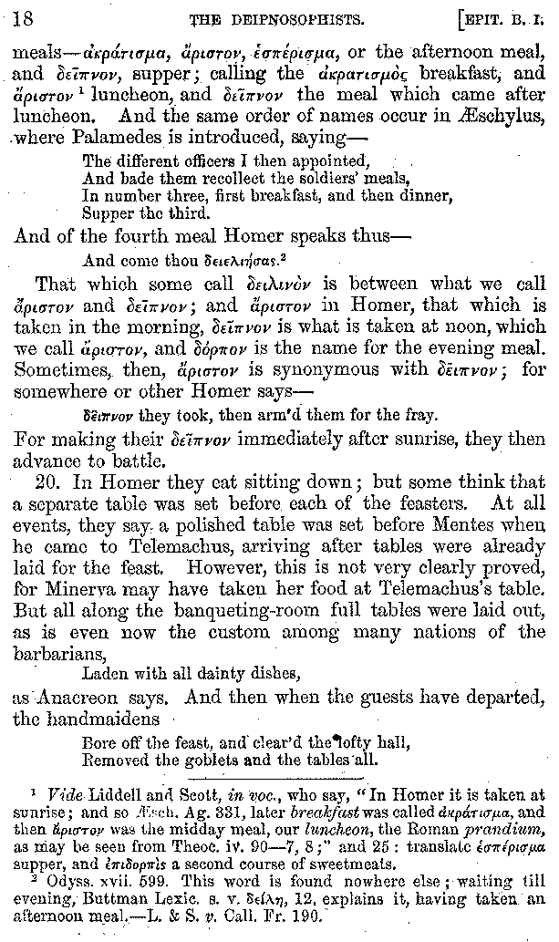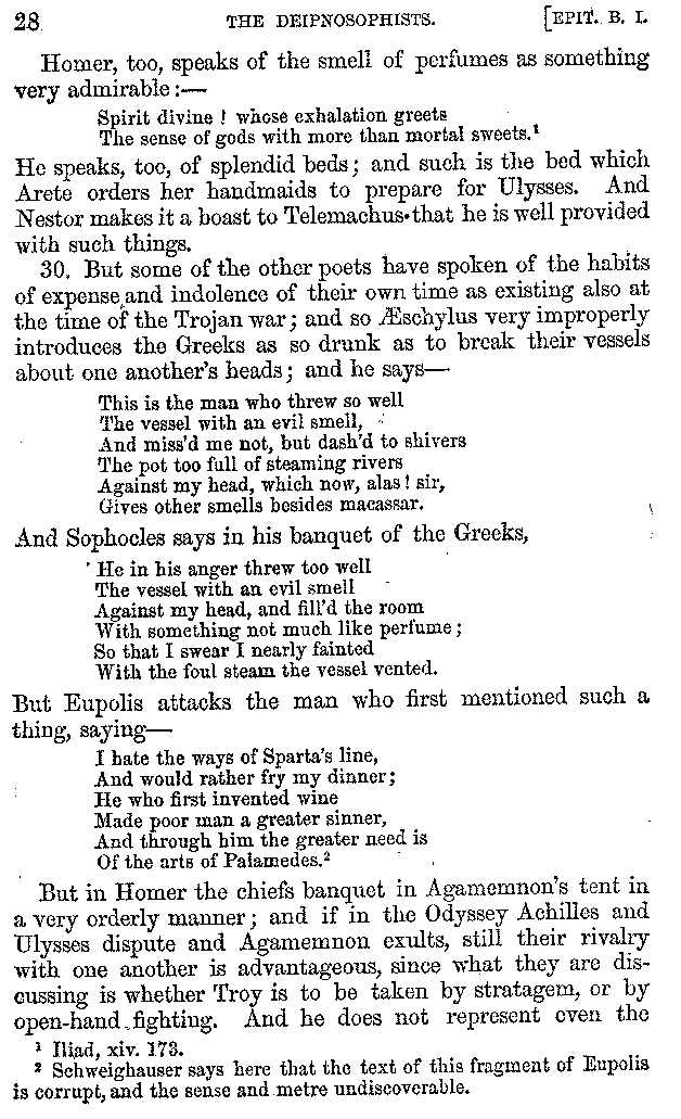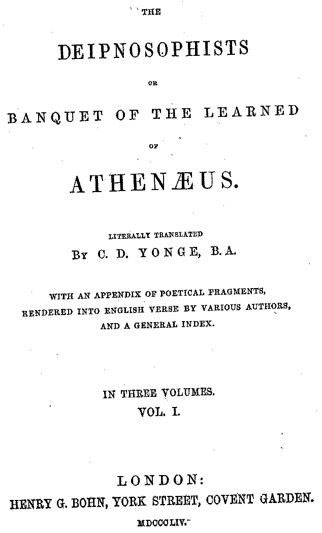 [iv] The first two books, and portions of the third, eleventh, and fifteenth, exist only in an Epitome, of which both the date and author are unknown. It soon, however, became more common than the original work, and eventually in a great degree superseded it. Indeed Bentley has proved that the only knowledge which, in the time of Eustathius, existed of Athenæus, was through its medium.
