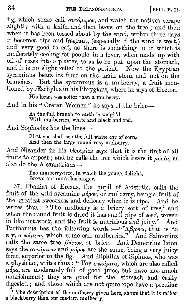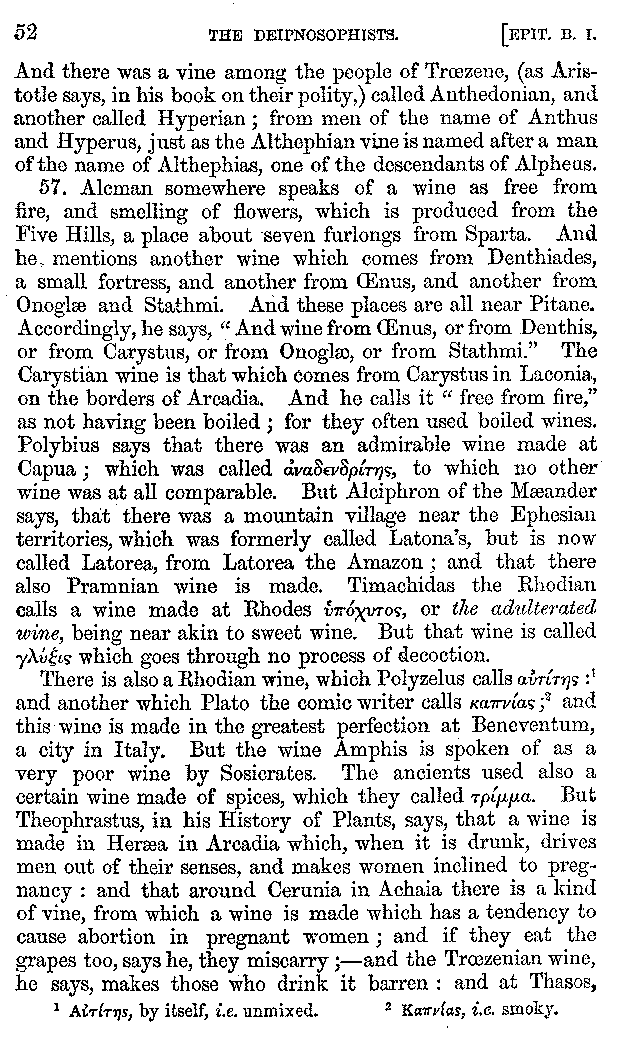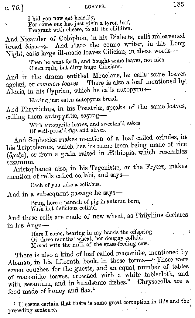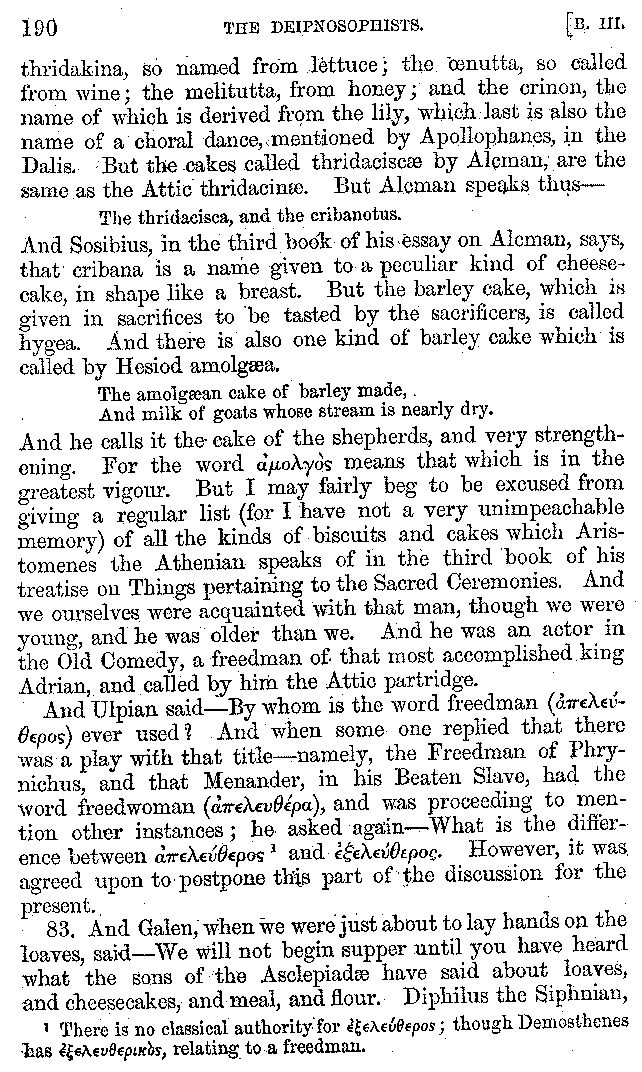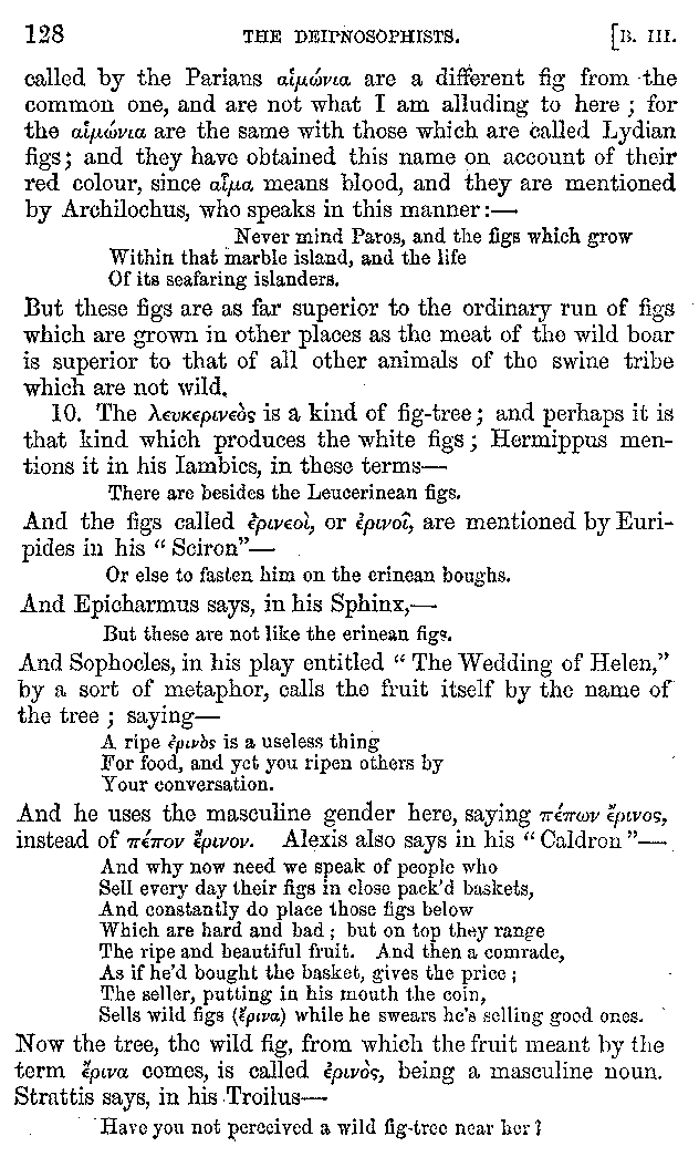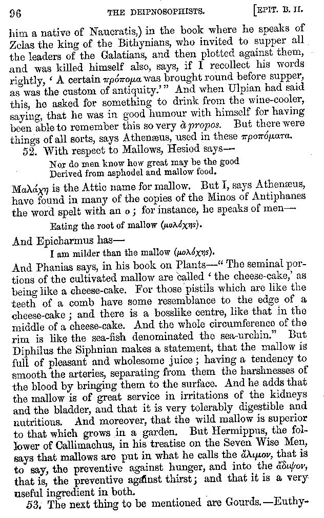 [iv] The first two books, and portions of the third, eleventh, and fifteenth, exist only in an Epitome, of which both the date and author are unknown. It soon, however, became more common than the original work, and eventually in a great degree superseded it. Indeed Bentley has proved that the only knowledge which, in the time of Eustathius, existed of Athenæus, was through its medium.