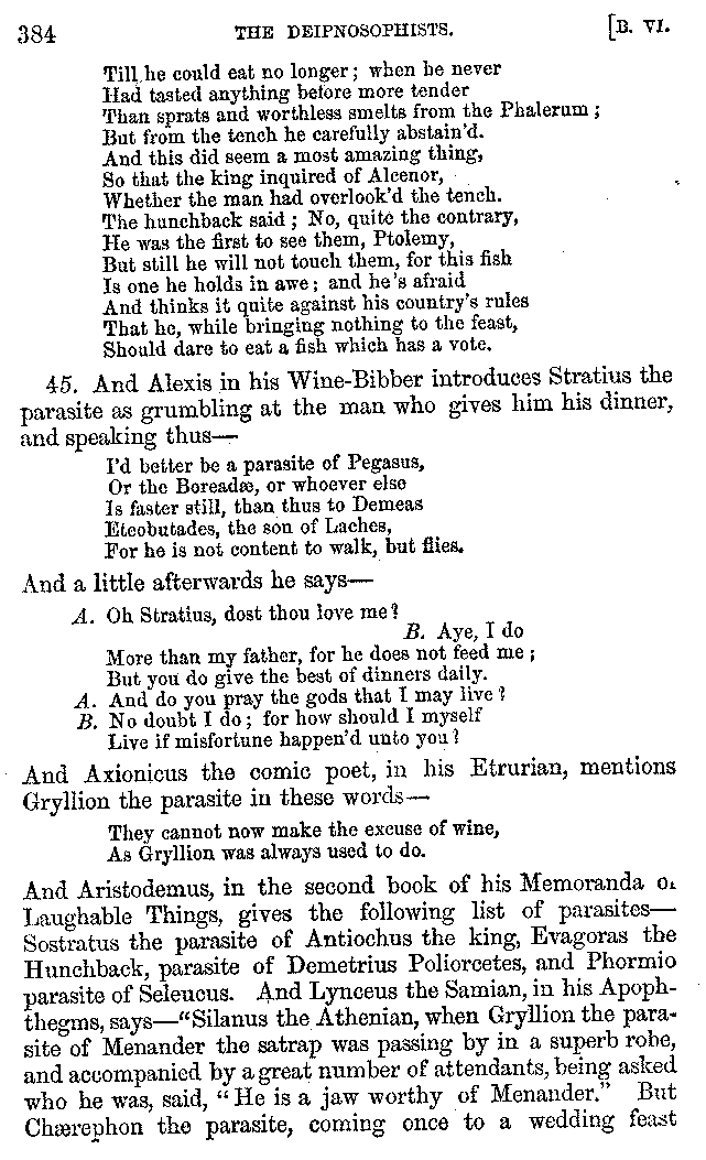 The same Clearchus says that Pithyllus, who was called Tenthes, not only had a covering to his tongue made of skin, but that he also wrapped up his tongue for the sake of luxury, and then that he rubbed it clean again with the skin of a fish. And he is the first of the epicures who is said to have eaten his meat with fingerstalls on, in order to convey it to his mouth as warm as possible. And others call Philoxenus Philicthus;[9:1] but Aristotle simply calls him Philodeipnus,[9:2] [10]writing in this way:—"Those who make harangues to the multitude, spend the whole day in looking at jugglers and mountebanks, and men who arrive from the Phasis or the Borysthenes; having never read a book in their lives except The Banquet of Philoxenus, and not all of that."