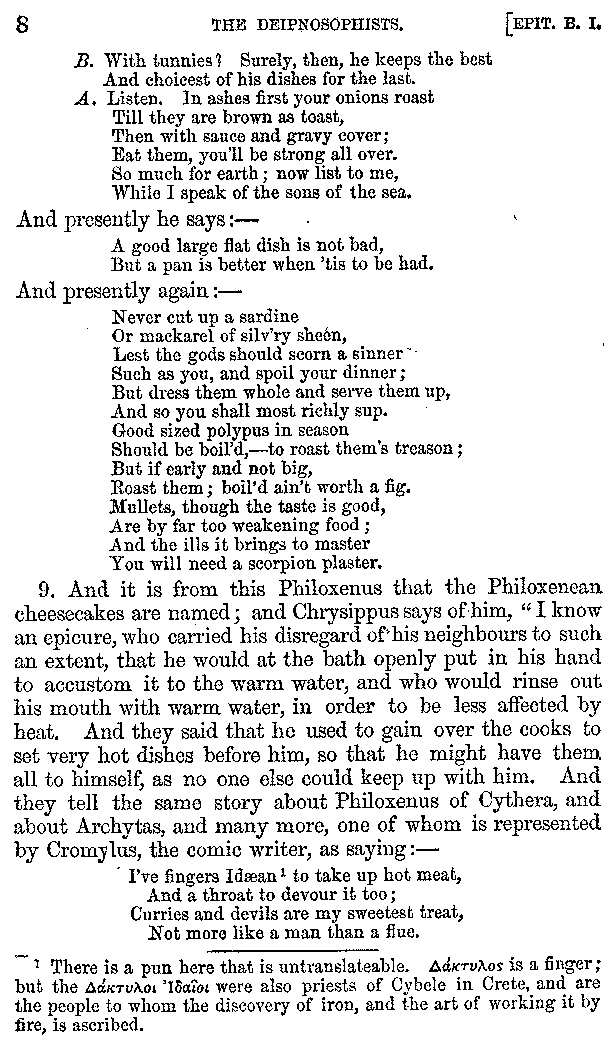 9. And it is from this Philoxenus that the Philoxenean cheesecakes are named; and Chrysippus says of him, "I know an epicure, who carried his disregard of his neighbours to such an extent, that he would at the bath openly put in his hand to accustom it to the warm water, and who would rinse out his mouth with warm water, in order to be less affected by heat. And they said that he used to gain over the cooks to set very hot dishes before him, so that he might have them all to himself, as no one else could keep up with him. And they tell the same story about Philoxenus of Cythera, and about Archytas, and many more, one of whom is represented by Cromylus, the comic writer, as saying:—