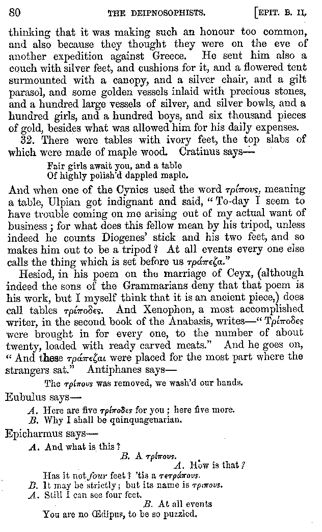 And of philosophers there were present Pontianus and Democritus, both of Nicomedia; men superior to all their contemporaries in the extent and variety of their learning; and Philadelphus of Ptolemais, a man who had not only been bred up from his infancy in philosophical speculation, but who was also a man of the highest reputation in every part of his life. Of the Cynics, there was one whom he calls Cynulcus, who had not only two white dogs following him, as they did Telemachus when he went to the assembly, but a more numerous pack than even Actæon had. And of rhetoricians there was a whole troop, in no respect inferior to the Cynics. And these last, as well, indeed, as every one else who ever opened his mouth, were run down by Uppianus the Tyrian, who, on account of the everlasting questions which he keeps putting every hour in the streets, and walks, and booksellers' shops, and baths, has got a name by which he is better known than by his real one, Ceitouceitus. This man had a rule of his own, to eat nothing without saying κεῖται; ἢ οὐ κεῖται; In this way, "Can we say of the word ὥρα, that it κεῖται, or is applicable to any part of the day? And is the word μέθυσος, or drunk, applicable to a man? Can the word μήτρα, or paunch, be applied to any eatable food? Is the name σύαγρος a compound word applicable to a boar?"—And of physicians there were present Daphnus [3]the Ephesian, a man holy both in his art and by his manners, a man of no slight insight into the principles of the Academic school; and Galenus of Pergamos, who has published such numbers of philosophical and medical works as to surpass all those who preceded him, and who is inferior to none of the guests in the eloquence of his descriptions. And Rufinus of Mylæa.—And of musicians, Alcides of Alexandria, was present. So that the whole party was so numerous that the catalogue looks rather like a muster-roll of soldiers, than the list of a dinner party.
