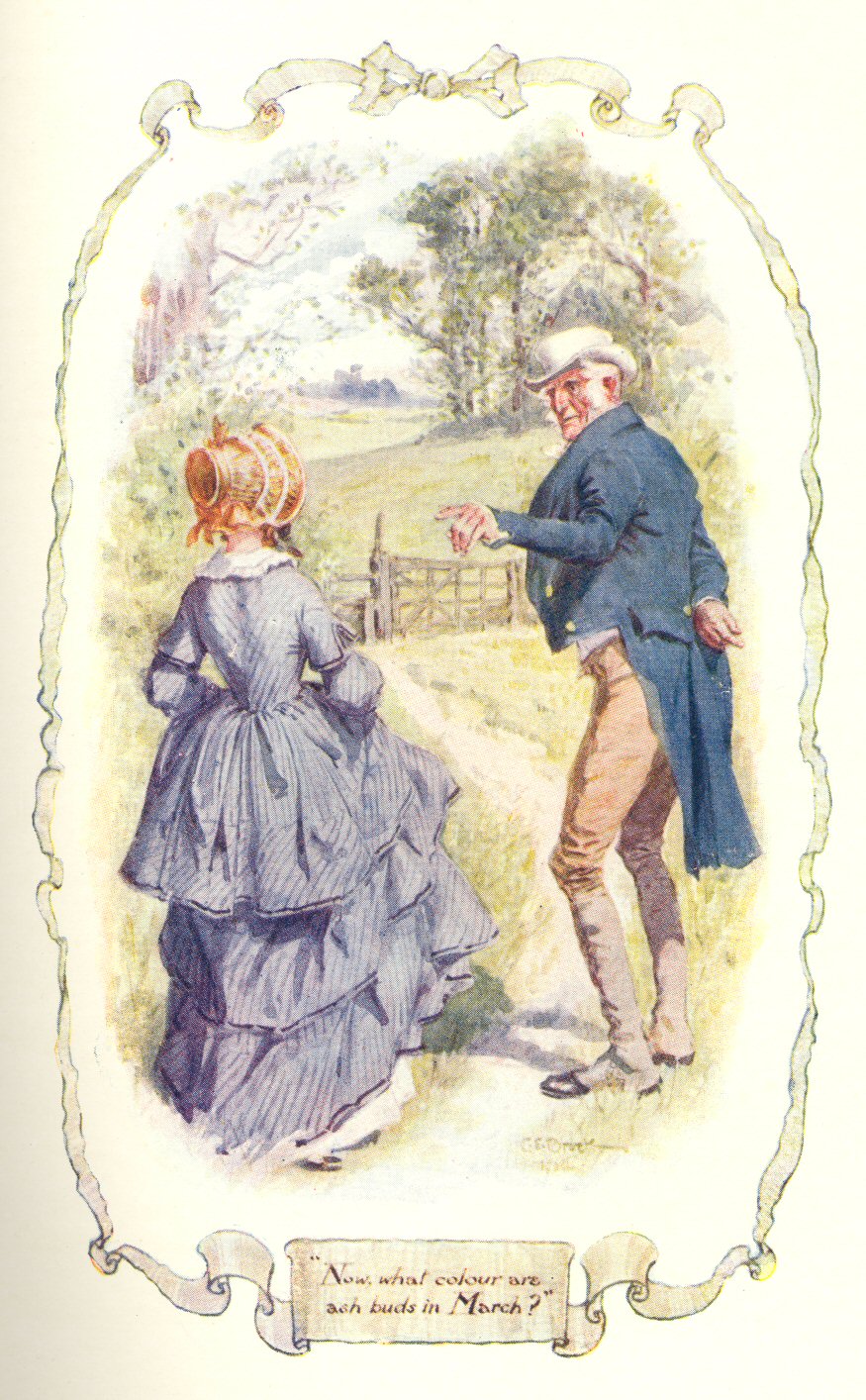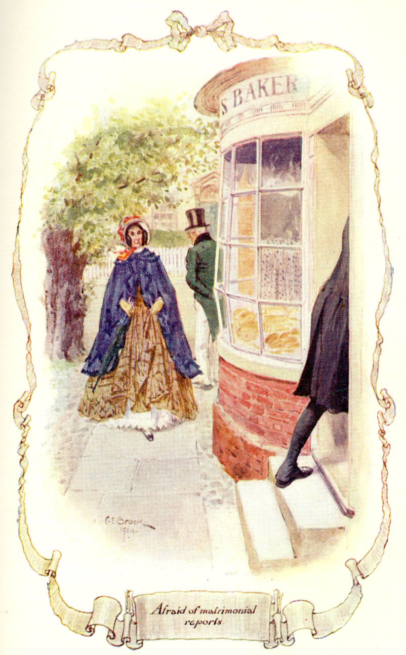 On coming out of church, the brisk Captain paid the most gallant attention to his two daughters. p. 10He nodded and smiled to his acquaintances; but he shook hands with none until he had helped Miss Brown to unfurl her umbrella, had relieved her of her prayer-book, and had waited patiently till she, with trembling nervous hands, had taken up her gown to walk through the wet roads.