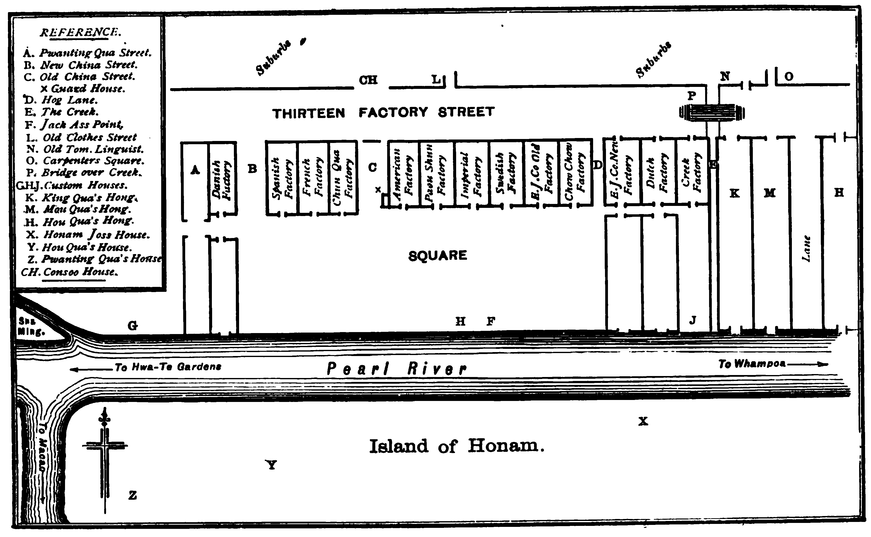 Beginning at the west, stood the Danish Factory; adjoining it were Chinese shops in its whole length, forming New China Street, which here intervened, separating it from the Spanish. Next the French, and by its side in its whole length, that of the Hong Merchant Chungqua; Old China Street here came in, and against it was the American, then the Imperial, by its side the Paou-shun, next in order the Swedish, the old[22] English, and then the Chow-Chow.[7] Now came a small narrow lane, the renowned Hog Lane, most appropriately named. The high walls of the new English Factory bordered the lane, having as next neighbour eastward the Dutch, and next to this stood the Creek Factory. The latter took its name from a small creek, which, running down along the walls of the city, here emptied into the river. Originally this creek formed the ditch of the west side of the city.