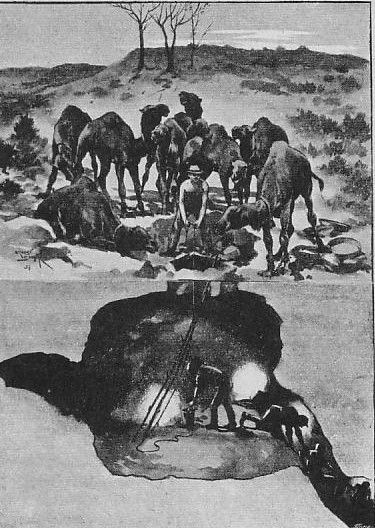Once clear of the town, what a strange collection of baggage animals, horses, camels, and donkeys! What a mass of carts, drays, buggies, wheelbarrows, handbarrows, and many queer makeshifts for carrying goods—the strangest of all a large barrel set on an axle, and dragged or shoved by means of two long handles, the proud possessor's belongings turning round and round inside until they must surely be churned into a most confusing jumble. Then we see the “Swagman” with his load on his back, perhaps fifty pounds of provisions rolled up in his blankets, with a pick and shovel strapped on them, and in either hand a gallon bag of water. No light work this with the thermometer standing at 100°F in the shade, and the track inches deep in fine, powdery dust; and yet men start off with a light heart, with perhaps, a two hundred mile journey before them, replenishing their bundles as they pass through camps on their road.