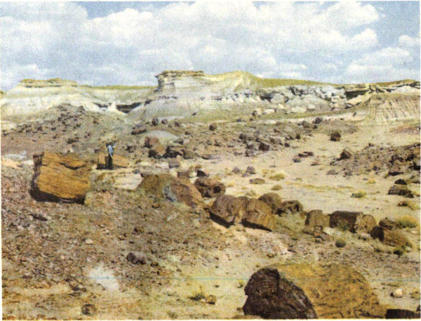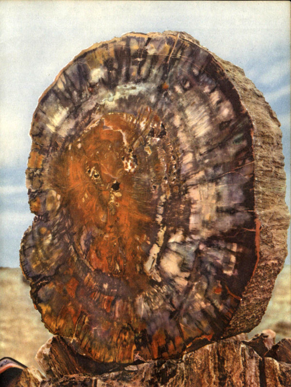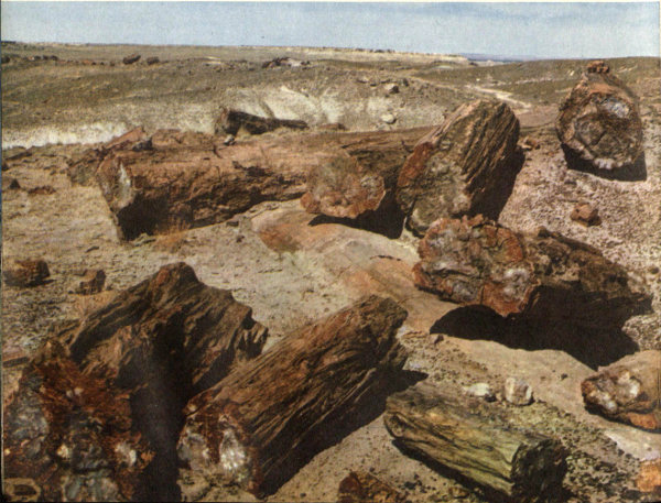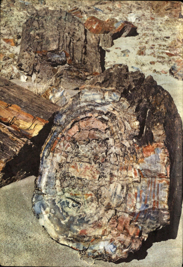During the latter part of what geologists call the Triassic period, about 160 to 170 million years ago, most of northeastern Arizona was apparently an extensive flood plain; low, flat, and swampy. Numerous streams, some of them quite large, flowed out from the surrounding low hills into the plain. These streams brought enormous quantities of sediments; mud, sand, and other minerals, spreading it out layer upon layer as they shifted their flow back and forth just as on present river deltas. These sediments contained huge amounts of volcanic ash which the streams apparently picked up near their sources. This ash was largely silica, the mineral which was later to be of major importance in the petrification of the wood. (Silica (SiO₂) is the oxide of silicon, a non-metallic element making up 28 per cent of the earth’s crust. The crystal form of silica is quartz, the commonest of all minerals, which is found in large amounts in many volcanic rocks.)
