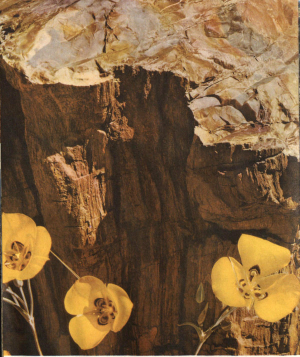 In contrast to the plants and animals of those Triassic times living in swamps and marshes, we now have plants and animals that are able to exist with a minimum of moisture. The present ground-cover is seldom over three or four feet high, but includes a wide variety of plants ranging from very small flowering herbs to the several species of gray-foliaged salt brush and other shrubs. With suitable moisture, the spring and fall wildflower displays are often very showy. The early blooms of the chimaya, phacelia, and the large, white, evening primroses are soon followed by desert mallow; vetch; a small white daisy-like Fleabane; the large yellow tulip-like flowers of the mariposa or sego lily; and as the season advances, the paint brush; asters; snake weed; golden aster; rabbit brush; and many others.