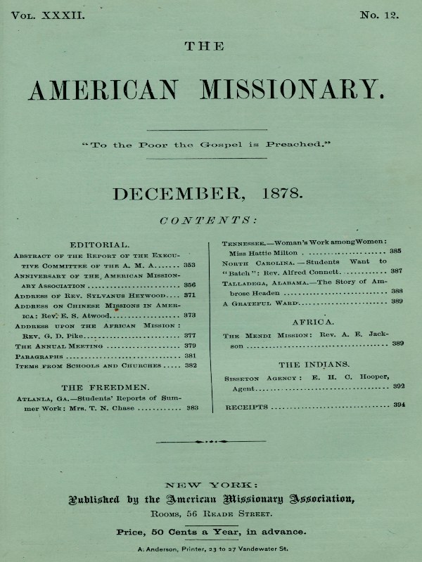 References to the co-operation of the Freedmen’s Missions Aid Society in England, the return of the Jubilee Singers, the changes successfully made in the form and editing of the AMERICAN MISSIONARY, and the generous aid of the American Bible Society, conclude the Report.