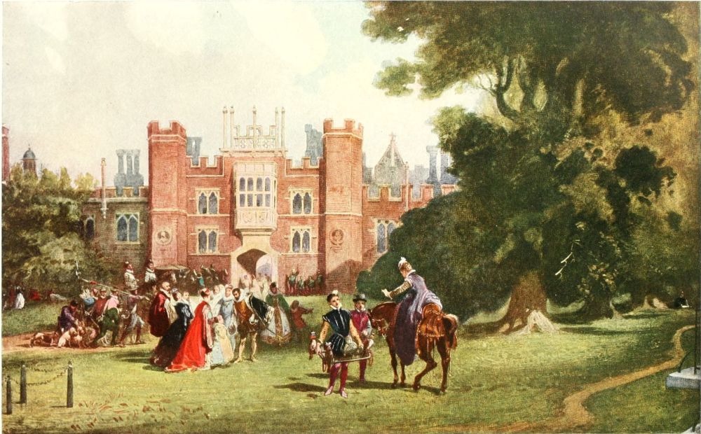Although Hampton Court (Nash’s delightful drawing of which is reproduced in colours as a frontispiece to this volume) is the private property of the Crown, it is usually open for inspection, and its splendid past is always an inspiration. It was due to Queen Victoria that the Palace and grounds, long neglected, were made available for the public. A politician with a gift for phrase-making has described it aptly as a place of “pleasure, leisure, and treasure,” which is true, though its educational value need not have been overlooked. A reference to its association with Wolsey occurs on p. 18, and much more could be written in connection with its early history, the period which provided Joseph Nash with the subject of the drawing reproduced here. Since Hampton Court was first built its appearance has been changed considerably, notably by Wren’s addition of the beautiful Fountain Court and other portions. The building provides many chapters of romance, sometimes connected with the restoration of hidden features. Especial interest, for instance, is attached to the stone bridge over the moat, built in the time of Henry VIII, buried in after years, and not reinstated until a few years ago.