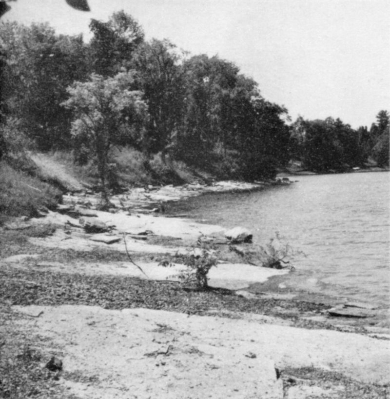 Approximately 75 vertical feet of the Glens Falls Limestone occur along the Park beach. The rocks are black[8] or blue-black on a fresh surface, gray or grayish-white on a surface which has been exposed to the weather. Most of the individual beds or layers are 5 to 7 inches thick (see Fig. 6) with the thickest being just under 5 feet. The beds are separated by thin “partings” of rock, many of which contain abundant fossils. The beds consist of massive limestone, shaly limestone or limy shale; the partings are generally limy shale or shaly limestone.