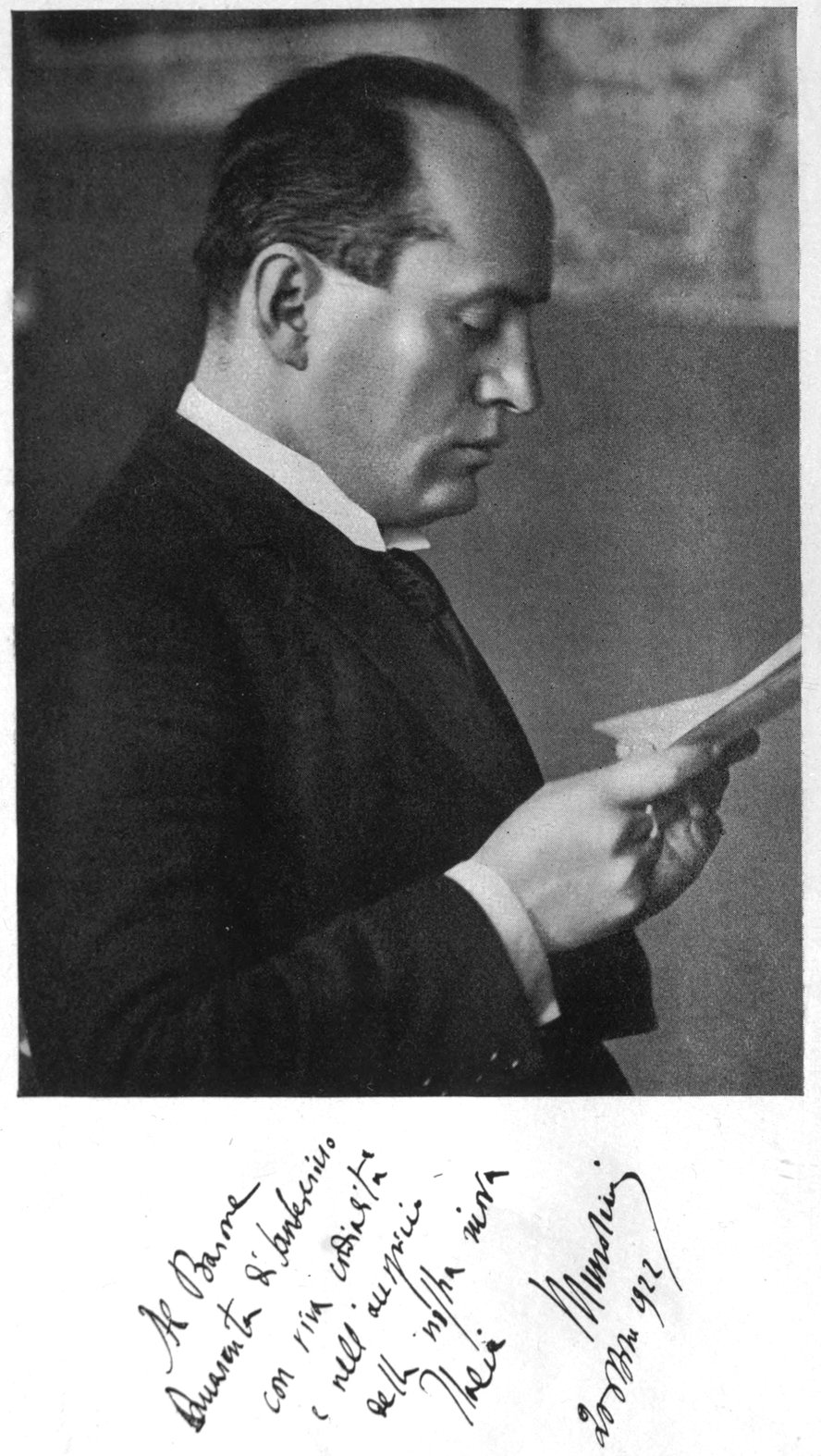 Few public men of our time have had a more rapid, brilliant and interesting career than Benito Mussolini, the son of a blacksmith. He is the youngest of his predecessors in this office, as he was born only forty years ago at Predappio, xviin the province of Forli, where the villagers still call him simply “Our Benit.” He was deeply attached to his mother, Rosa Maltoni, and her death caused him intense sorrow. He has one sister, Edvige, and a younger brother, Arnaldo, who, since the elder one has become Prime Minister, has taken his place as editor of Il Popolo d’Italia. Mussolini first worked in his father’s forge and then, having occupied for a time the position of village schoolmaster, emigrated to Switzerland, from which country he was, however, expelled on account of articles he had written advocating the Marxist doctrines. Returning once more to Italy, he became an active member of the Socialist Party and finally editor of its organ, the Avanti. Upon the outbreak of war in 1914, with his keen political insight, Mussolini saw the necessity of Italian intervention, and in consequence was forced to leave the official Socialist Party, giving up all the positions he held in it. He founded his Popolo d’Italia, and began fiercely to sound the trumpets of war, inciting his country to abandon her neutral attitude and to throw in her lot with the Allies. He gained his end, and in 1915 he went to the front as a simple soldier in the 11th Bersagliere Regiment. In 1917, as the result of the bursting of a shell, he received thirty-eight simultaneous wounds; he was obliged to go to hospital, was promoted on the field, and invalided out of the Army. He then returned to Milan, and having resumed the editorship of his paper, the Popolo d’Italia, began his political battles, and continued to fight through its columns, spurring his countrymen on to final victory.