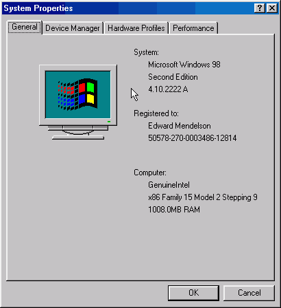 A few computer experts (or, more accurately, a few people who consider themselves to be experts) have insisted to me that it is absolutely impossible to build a stable Windows 98 SE system with 1 GB of RAM, a Pentium 4 CPU, and the ability to use USB 2.0 or writable DVDs. They are misinformed (and I am writing these words on exactly the kind of system that they insist can not possibly exist). The linked images portray the memory and CPU of my current Windows 98 SE system, its USB 2.0 support, and its writeable DVD software.
