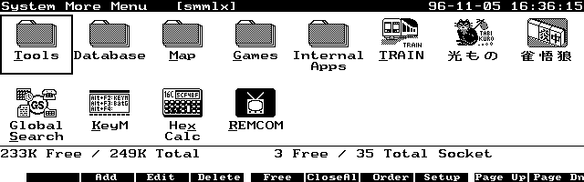 SMMx displays a menu that looks similar to the AppManager menu, but displays the EXM applications added using MoreEXM (see screen below). A unique feature of SMMx, not found on AppManager, is that it lets you display folders of related materials, and data files, as well as programs. If you select a folder, it leads you to another menu listing the files in that folder. If you select a data file, SMMx checks its file name extension, searches for the application it is associated with and opens it.