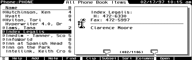 ZOOMC acts intelligently. Suppose, for example, that you start ZOOMC in Phone on your 200LX. The ZOOMC hot key blows up just the data card. Toggling with the Zoom key, you can get an index view with the data card.