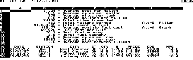 I keep a detailed record of all the gasoline fill-ups for my vehicle. I have fashioned a Lotus spreadsheet to handle this, with some help from Tom Gibson at The HP Palmtop Paper (ftp://ftp.palmto p.net/pub/mileage.zip =). I have a Lotus macro that accepts new data, such as the date, location, amount spent, price per gallon and odometer mileage. The spreadsheet keeps a running tally of all sorts of numbers like average miles per gallon, total spent on fuel, average miles driven per day, etc. There is also a macro to view a graph of the mileage over time.