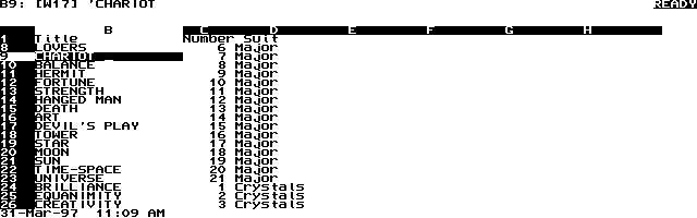 The @rand function in @vlookup(@int(78*@rand)+1,$deck,1) creates a random number between 0 and 1. Taking the integer part of that number after multiplying by 78 and then adding 1 creates a random number between 1 and 78. The Vertical Lookup, @vlookup function searches for that number in the above table. The last argument "1" in the @vlookup function says to use the contents of the cell 1 column over as the resultant value. In the example in Screens 12 and 13, the random number was 51 and "PURITY" was the value.