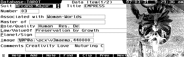 Unfortunately, early experimentation has yielded PCX images that aren't of good enough quality given the detailed full-color imagery of the Voyager deck. Other tarot decks would be better suited. Storing the card's image in the database is valuable because of the importance of what the visual symbology and imagery evoke. The use of 6K PCX graphic files associated with databases has much promise in other reference and learning material.