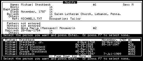 Although I have only a small portion of the program on the palmtop, I have everything I need to add new people to my files and modify their listings, including the note files. Now, when Imp paging through church baptismal and death records in the local County Historical Societies library, if I find any listing for a Steckbeck I can check my records to see if they're already in our files. Being able to run this program on my palmtop has been a tremendous boon to my research. And being able to download the data files back to my desktop unit allows me to keep our permanent records up to date.