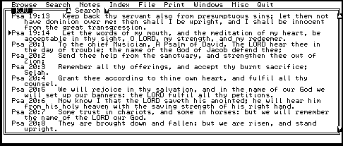 Vie begun using only my palmtop in church rather than my regular King James Bible. The printing is a bit smaller than my regular printed Bible, but moving to any chapter and verse is a snap. I can even search for specific words or phrases, although a long list of matches can take a bit longer than one would want, since the program is running on an 80186 processor.