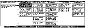 TODO.EXM displays ToDo's in a spreadsheet-style format with columns A-Z and 99 rows (see Screen 1). Each cell can have a ToDo note with a start date, due date and last time edited date. You can adjust the size of each cell, which will show more or less cells on the screen at once. There is a size adjustable data card window, which will show all of the text for the currently selected ToDo cell. You can put a title on each column. You can sort columns in different ways. You can jump around the rows and columns quickly. TODO.EXM is one of those programs that is worth a try if only to see if it helps.