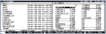 The screen items are defined in what I call the "X-Files" (they use extensions .xfd, .xfe, .xff, .xfk, .xfl, and .xfm). These will be located in their own directory (C:\PALMTOP is the default) or they may even be kept in an LZH archive. The X-Files contain drive or directory paths for the file manager (.xfd), executable DOS and/or XF commands (.xfe and .xfm), symbolic links (.xff), or nothing at all (.xfk and .xfl). These last two are zero byte files with the hex code of an application hotkey or the name of an EXM as their name! If you download XFP3.ZIP from SUPER, it contains X-Files for drives, .xfk zero-byte files for built-in apps and a program that will create .xfl zero-byte files for all the EXMs installed in App Mgr and MoreEXM.