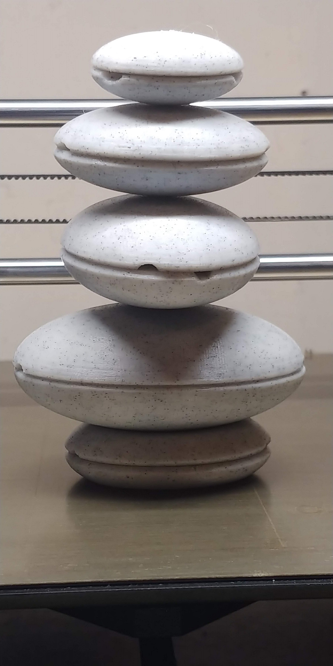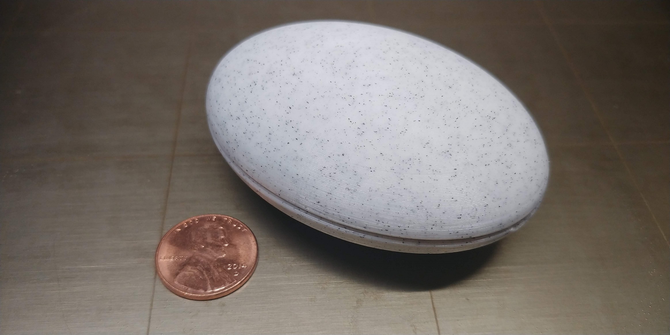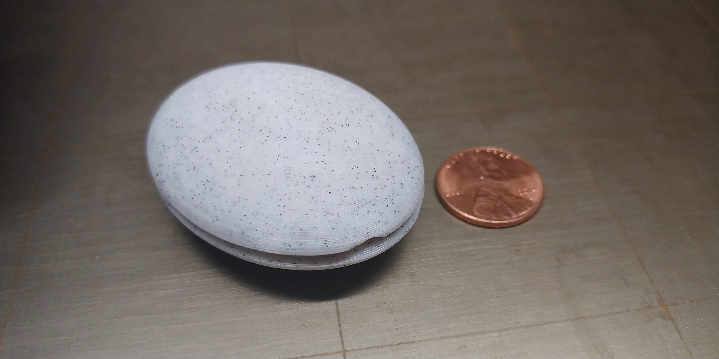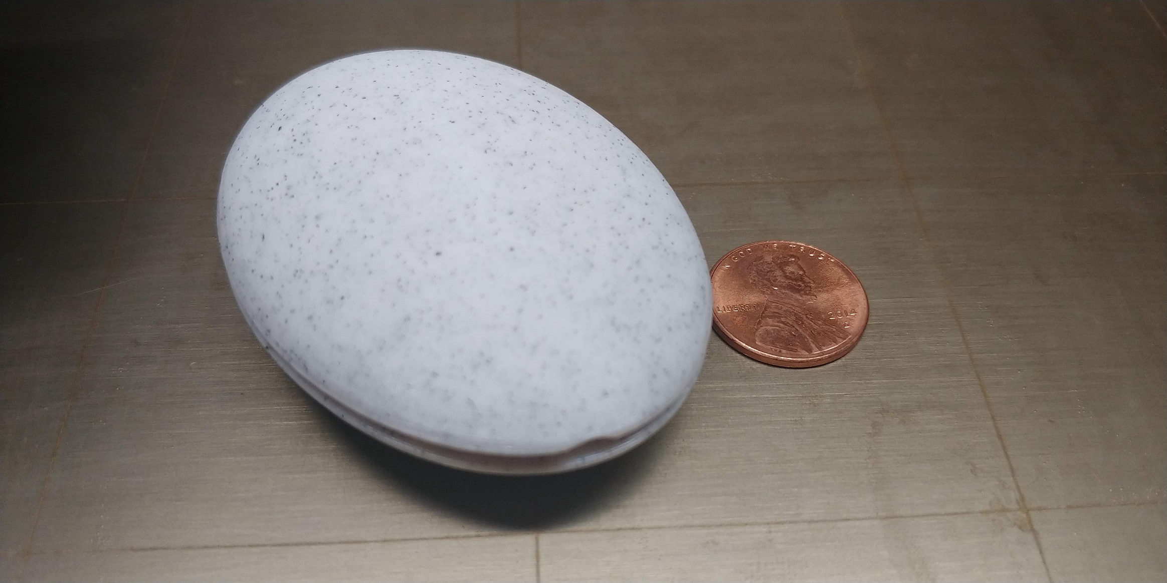 One of the coolest things about the Pebble family is that the magnet spacing and teflon rails are the same for all of them, making it possible to mix and match parts of one size with another. Also, if you buy two different colors, you can match the halves and have two dual-color Pebbles. The photos on this page are of Pebbles printed in "marble" style PLA filament, which is a light gray with black specks that resembles stone.